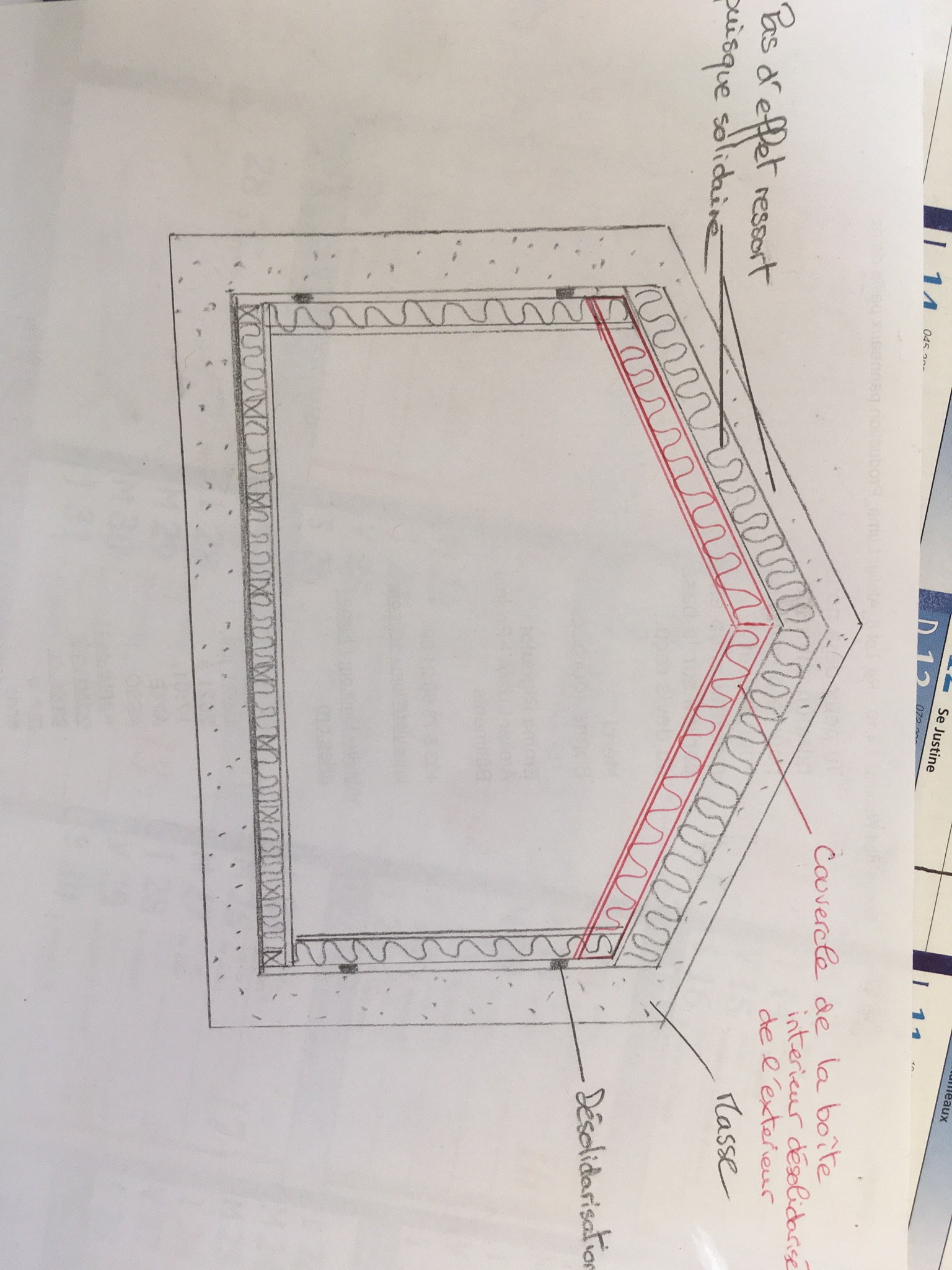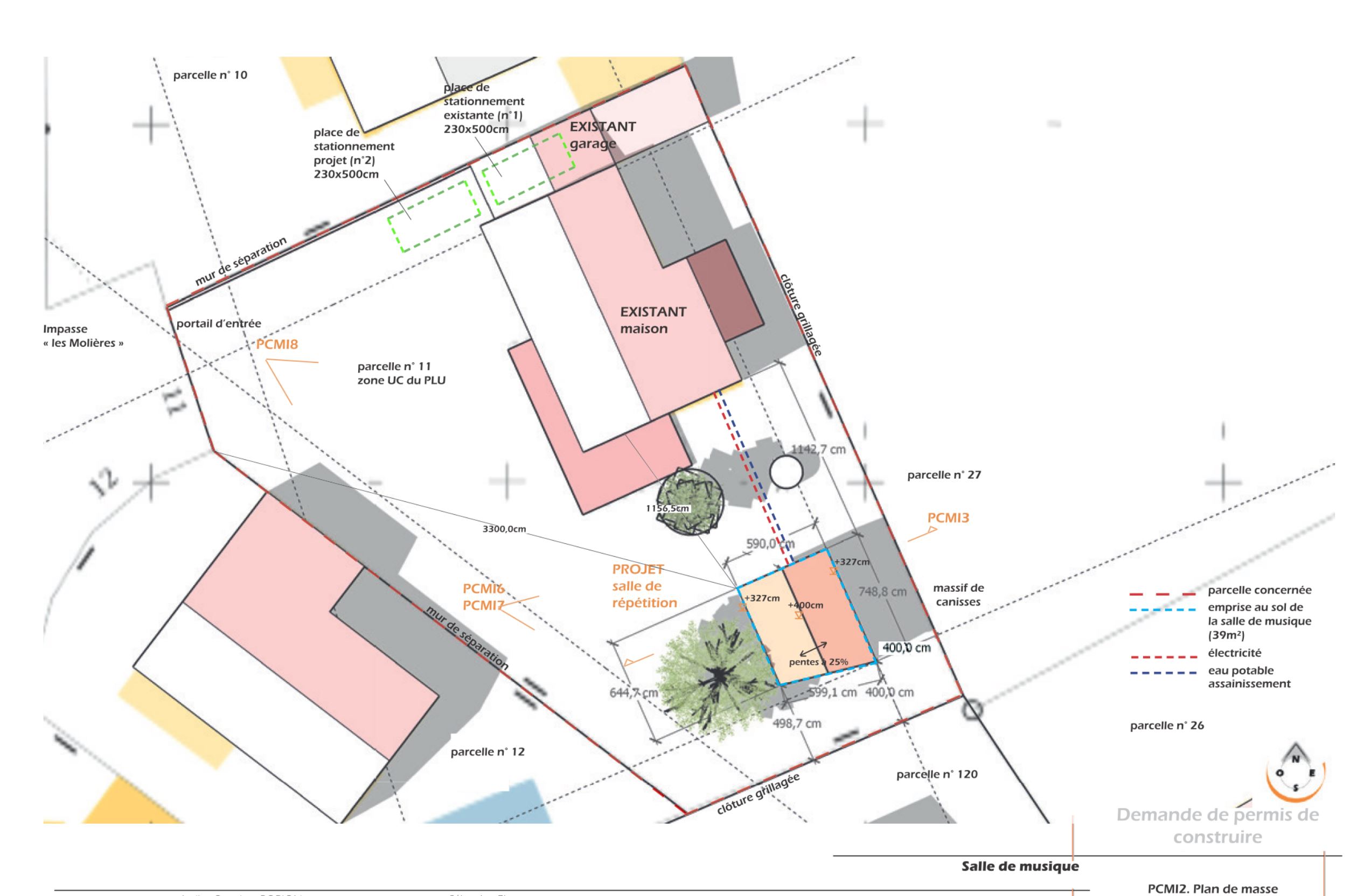 Construction d'une salle de musique en plein coeur d'un lotissement résidentiel pour un batteur. Niveau sonore à maîtriser : 110 dB. Recherche de masse/ressort avec des matériaux naturels. Nous avons opté pour une boite masse en terre et une boite ressort désolidarisée ossature bois et ouate de cellulose. Un chape au mortier a également été mise en oeuvre sur la toiture pour apporter un peu de masse. Il y a une toiture isolée avec 300 mm de ouste de cellulose et une sous toiture suspendue non solidaire de la toiture en absorption avec 100 mm de panneau de paille de riz. Très bons résultats.