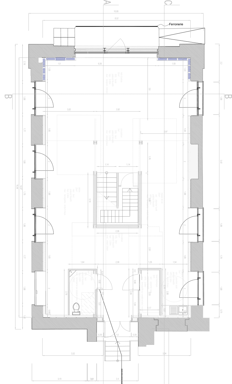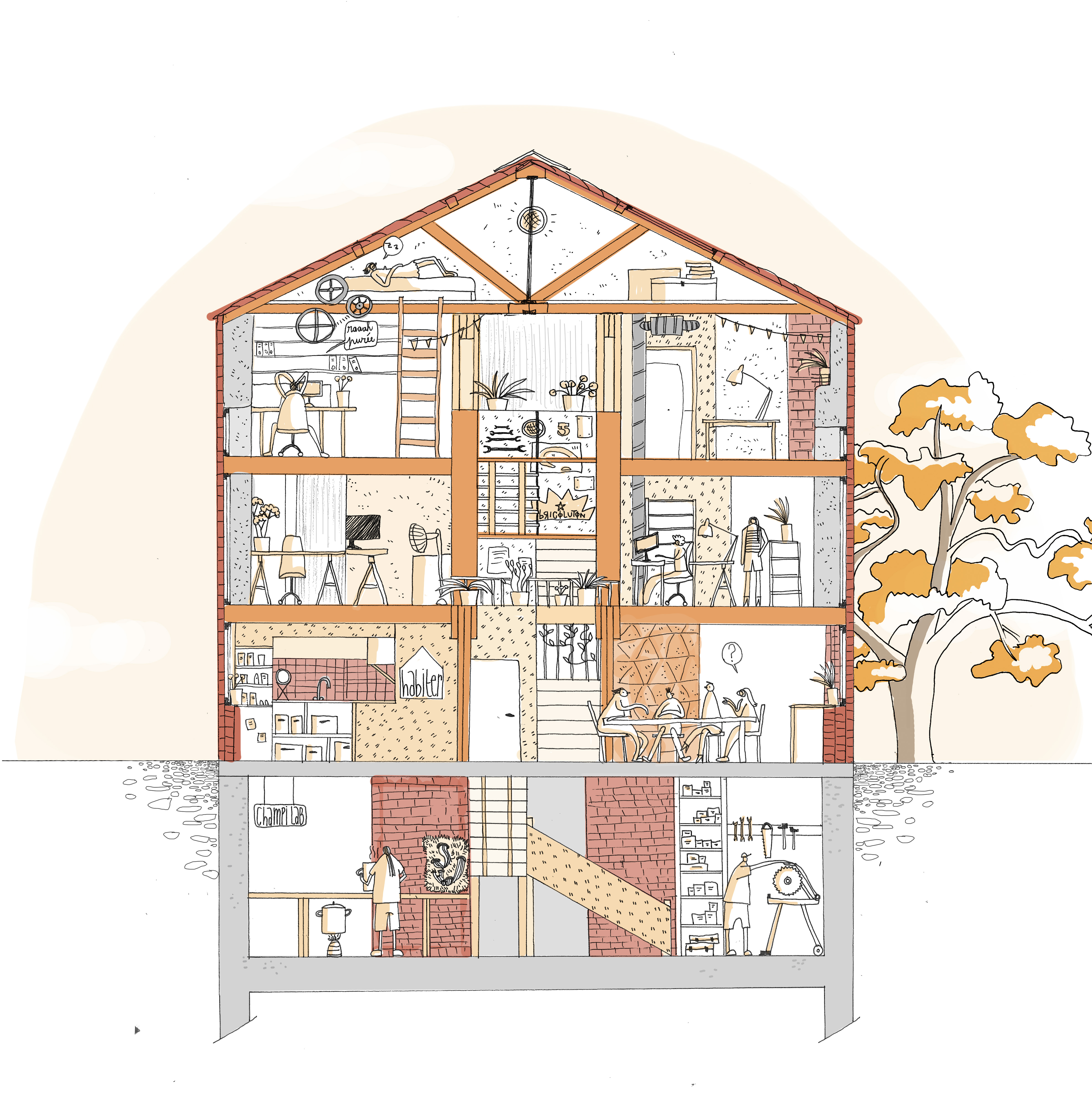Descriptif technique de l'aménagement : Etant entièrement participatif, les techniques utllisée durant ce chantier sont lowtech, facilement réadaptable et reproductible. La logique structurelle de ce projet repose sur une rangée centrale de poteaux et de poutres, intégrant le système moisé-moisant. Les murs existants accueillent des poutres muralières qui supportent les solives, redistribuant ainsi les charges vers les fondations existantes. Pour le premier étage en encorbellement, des jambes de force massives au rez-de-chaussée sont utilisées pour accompagner le déplacement vers l'escalier. Le cloisonnement au rez-de-chaussée est partiellement réalisé avec des briques de terre crues moulées (adobe), fabriquées lors de chantiers participatifs. L'isolation des murs est à base de chanvre habillée d'un enduit à la chaux.