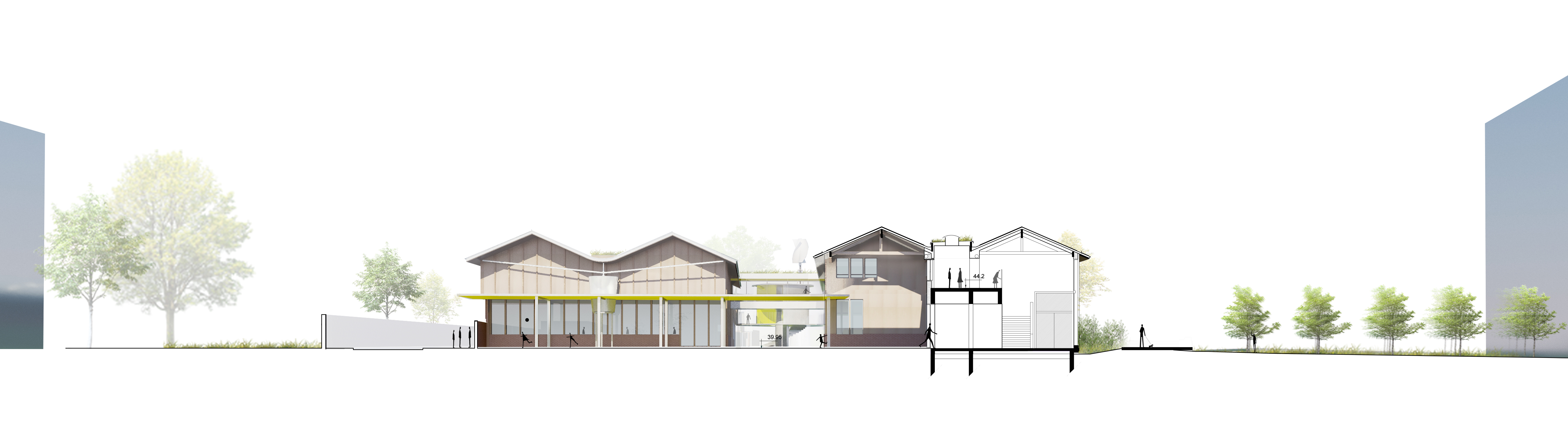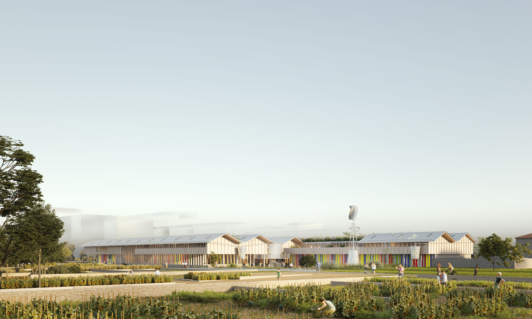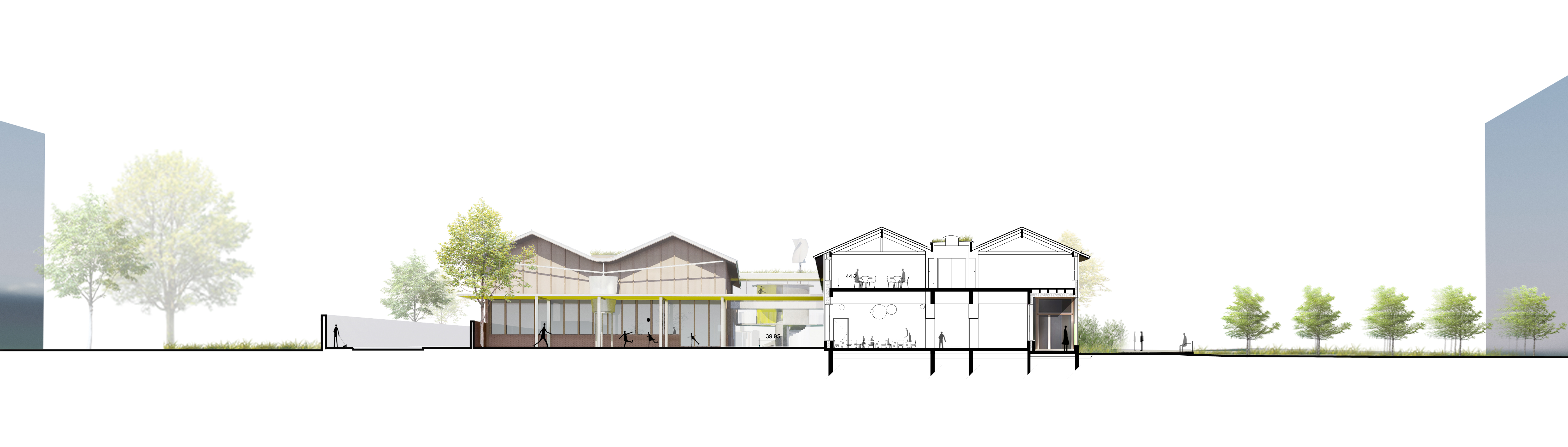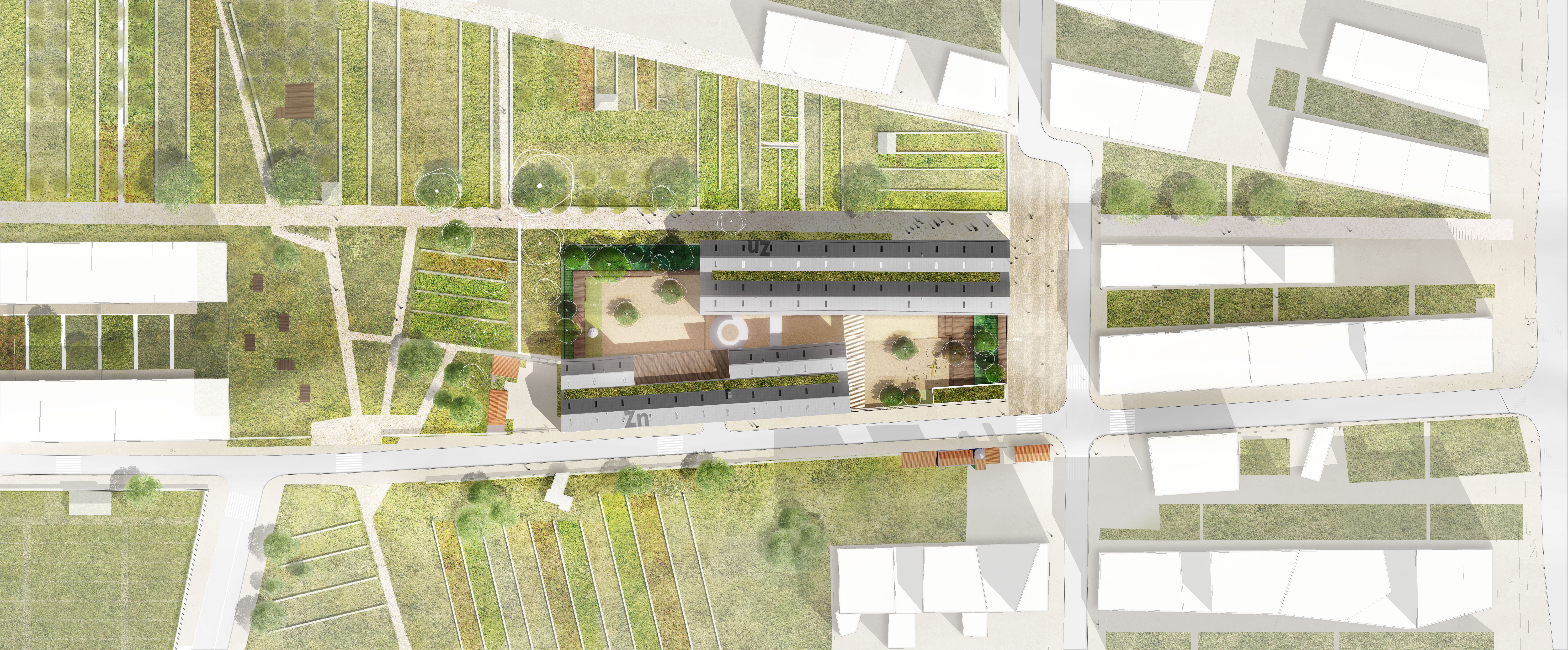 Approche environnementale : L’idée portée par le schéma directeur de reconstituer un tissu original qui hybride les fonctions urbaines et agricoles est l’affaire de chaque projet de la zac et une occasion exceptionnelle de valoriser le patrimoine du lieu. L’insertion en lanière le long de la digue des écoles permet d’accompagner la dynamique des flux piétons, de ménager une faille visuelle centrale et d’annoncer par un ancrage ponctuel sur l’alignement urbain du parvis une porte d’entrée sur le parc agricole. Le projet met en scène la récupération des eaux de pluie par un réseau de citernes et de rétention naturelle.