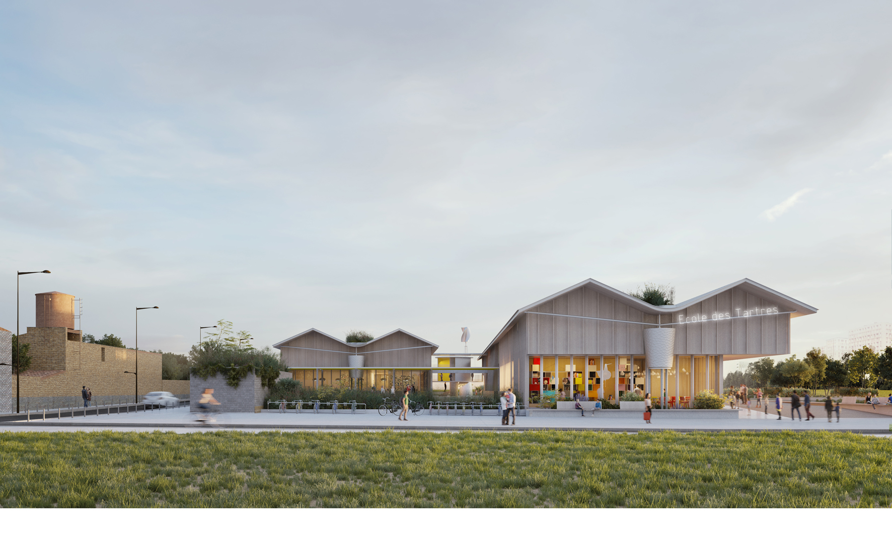 Le groupe scolaire des Tartres articule le tissu faubourien de l'avenue de Stalingrad et l'emprise agricole historique des spécialistes maraîchers de Stains, Pierrefitte et Saint-Denis. La mémoire agricole est profondément inscrite dans le site. L'école et la maternelle, grandes longères de bois, y font écho avec leurs citernes et leurs pignons aux débords de toiture. La construction est rationnelle et s’inspire des maisons de plâtre traditionnelles des maraîchers : une base solide et le reste en tout venant. Ici la base est en béton et le reste est en bois, matériaux plus léger et durable.