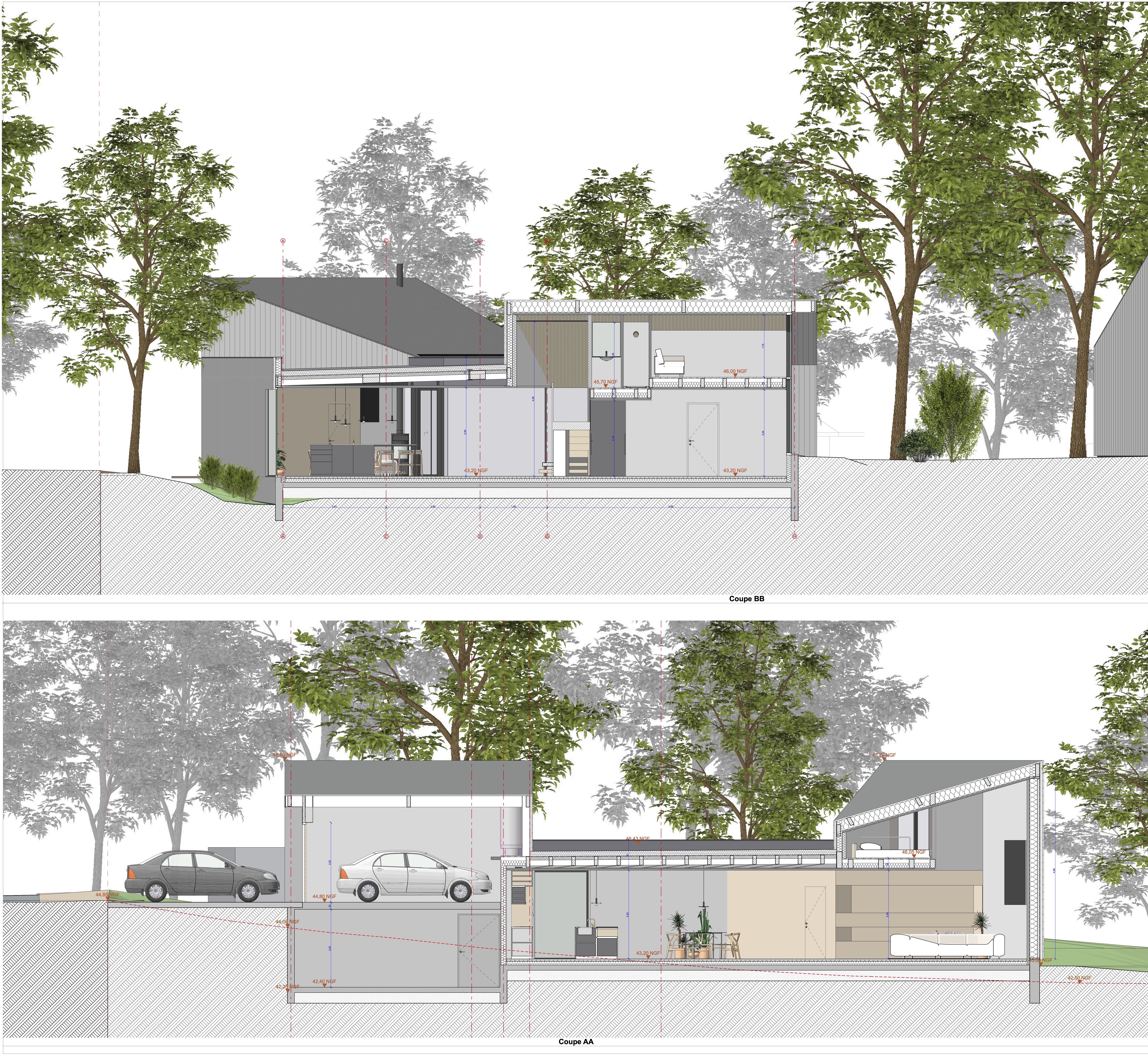 Approche environnementale : L'implantation de la maison respecte les principes bioclimatiques: Elle est implantée au plus proche de la limite Nord du terrain et possède très peu d'ouverture au Nord. Les ouvertures sont principalement au Sud / Sud-Est de manière à bénéficier des apports solaires gratuits en hiver lorsque les chênes ont perdu leur feuilles. En été, l'ombre des arbres combinée aux légers rebords de toit empêchent les rayons de soleil de pénétrer directement et donc de trop chauffer la maison. A l'Ouest, côté route où les arbres ne peuvent pas jouer ce rôle de masque, une seule très petite fenêtre.