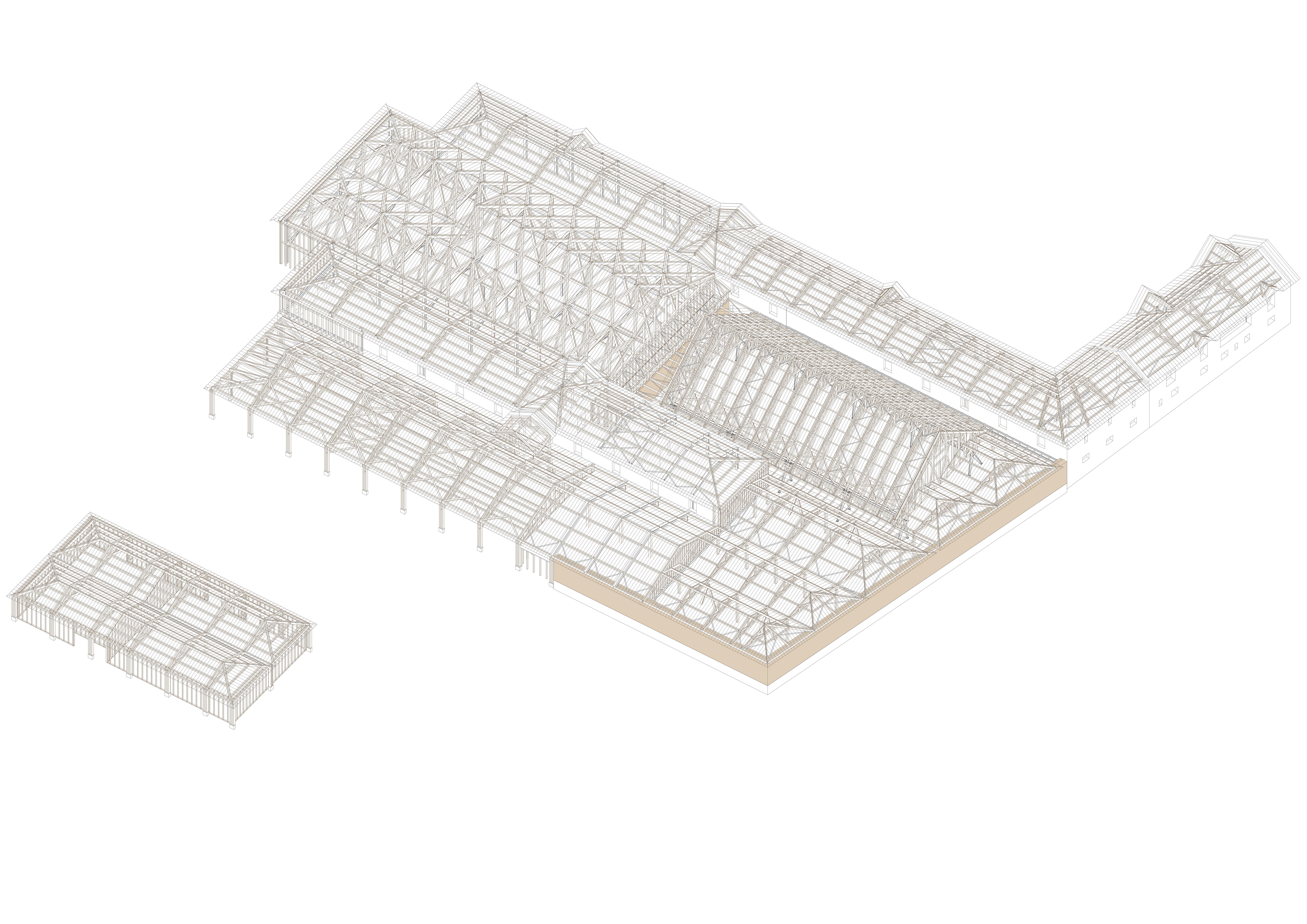 L’architecture naît d’une suite d’espaces dont la série vient du process viticole et des visites. Une halle de vendanges accueille le travail sous une charpente en bois massif moisé, peint en rouge. Le cuvier, lieu de travail et de la lumière, est structuré par une charpente en bois massif composée en losanges et portée par des poteaux en V. Le chai, sombre et introspectif, sous une haute voûte en bois massif moisé apparaît, posée sur des compas en acier. Un long escalier en acier et chêne massif conduit à une salle de dégustation lumineuse, offrant une vue sur les vignes jusqu’à perte de vue.