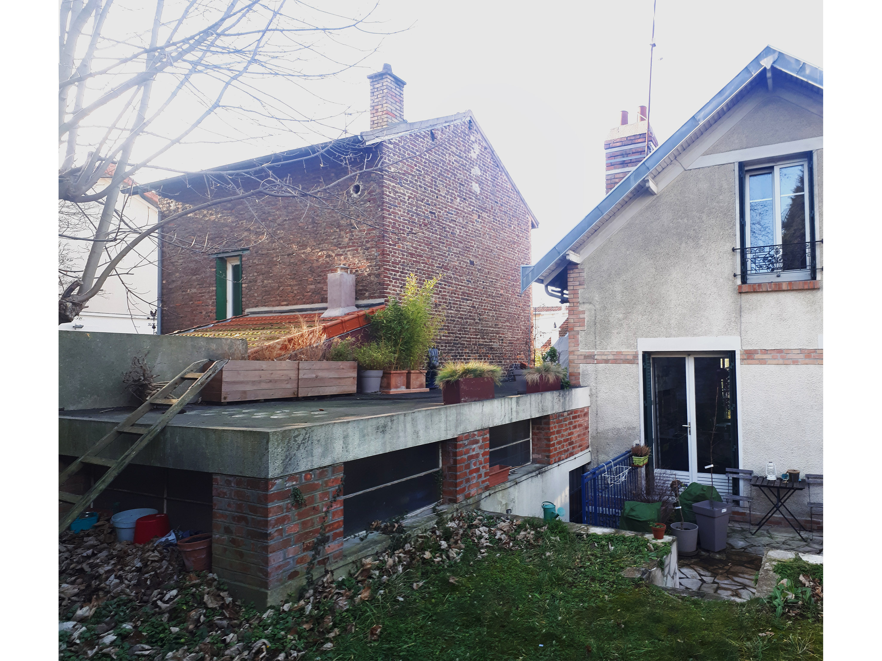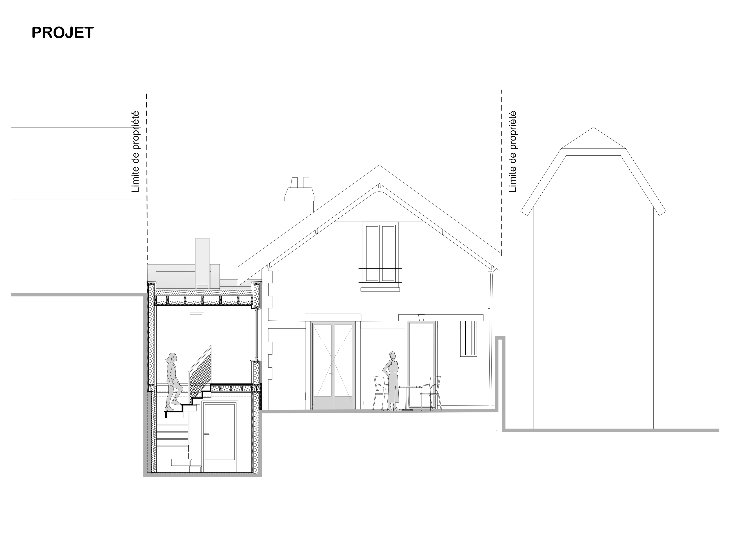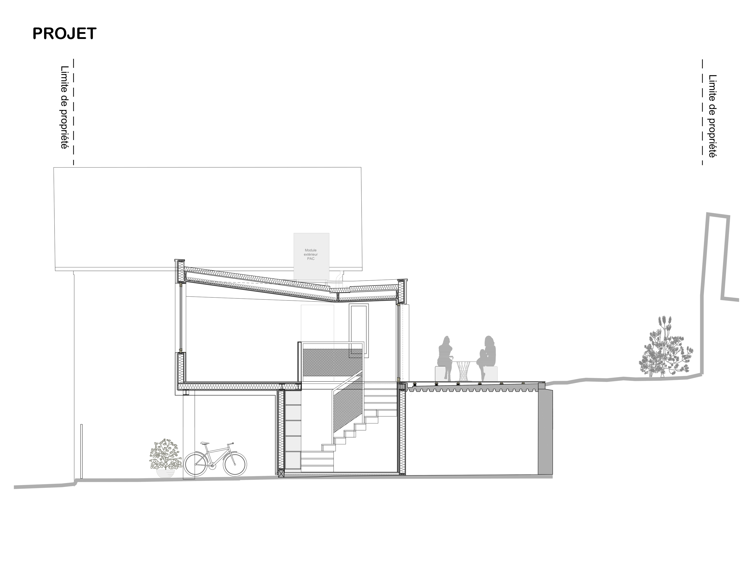 Approche environnementale : L'objectif a été de densifier et rénover une meulière francilienne en valorisant ce patrimoine bâti caractéristique. Durant les études, un audit énergétique de la maison a été réalisé afin de cibler les travaux de rénovation de la maison existante et limiter ses consommations. Les murs de la maison sont isolés, les menuiseries sont remplacées par des menuiseries bois double vitrage. Une VMC hygro B et une pompe à chaleur double service air/eau sont installées ainsi qu'une cuve de récupération des eaux pluviales pour l'arrosage (en lieu et place de l'ancien escalier d'accès au jardin).
