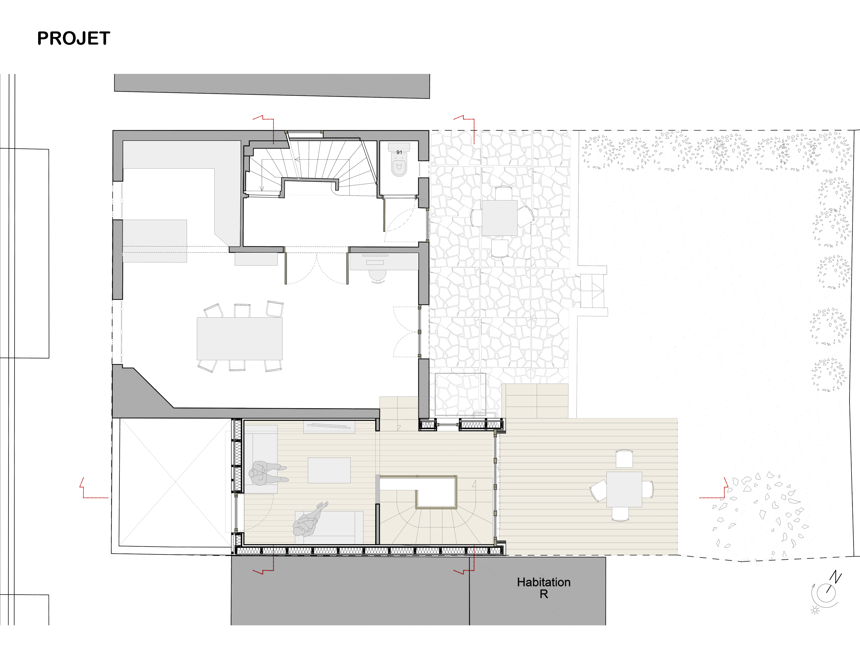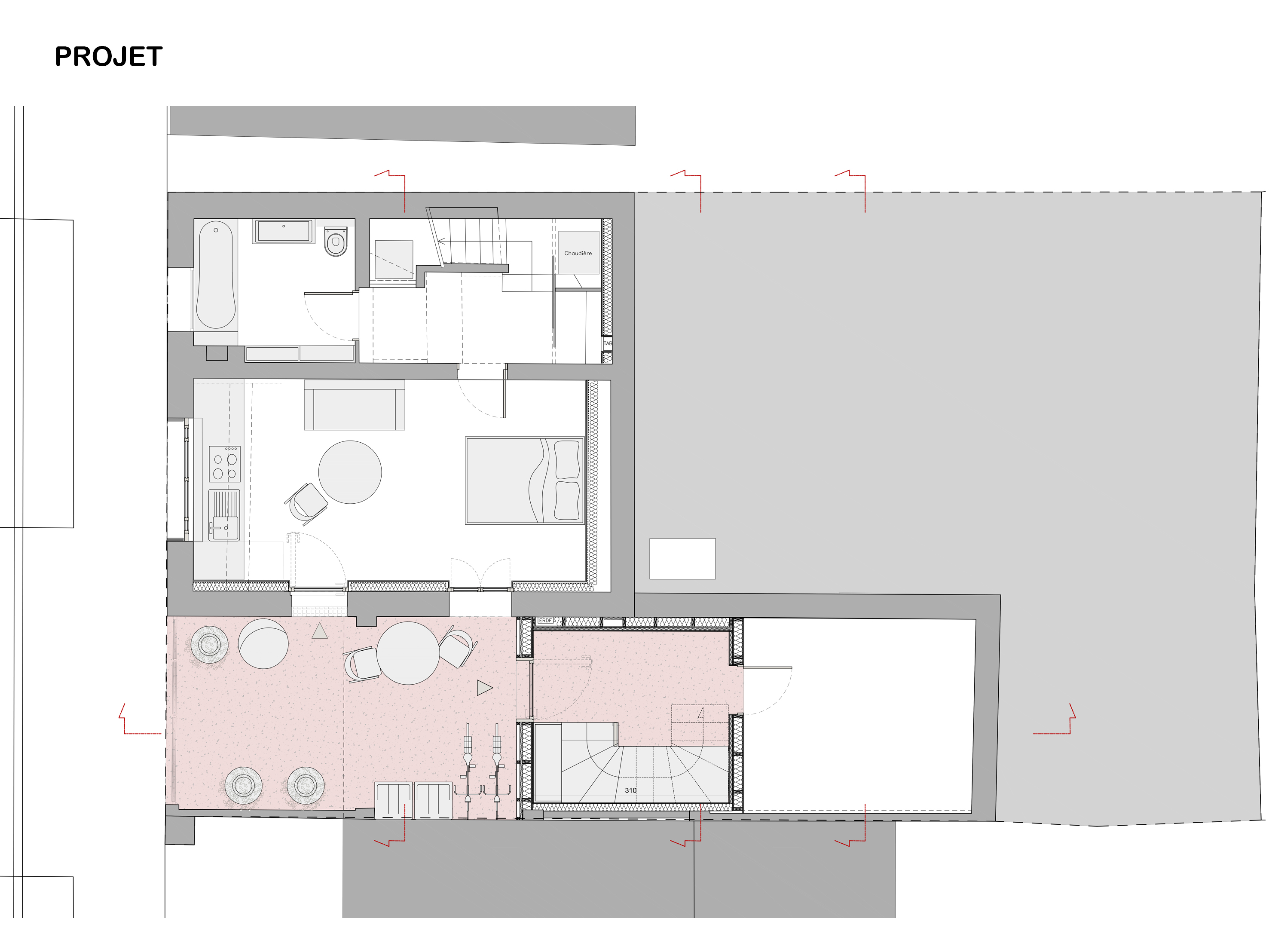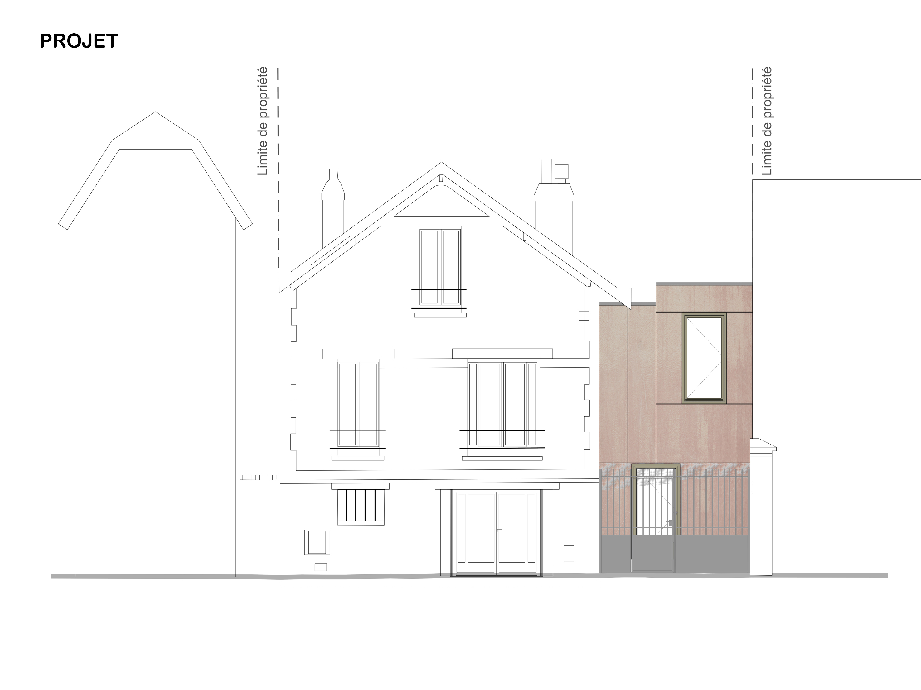 Approche environnementale : L'objectif a été de densifier et rénover une meulière francilienne en valorisant ce patrimoine bâti caractéristique. Durant les études, un audit énergétique de la maison a été réalisé afin de cibler les travaux de rénovation de la maison existante et limiter ses consommations. Les murs de la maison sont isolés, les menuiseries sont remplacées par des menuiseries bois double vitrage. Une VMC hygro B et une pompe à chaleur double service air/eau sont installées ainsi qu'une cuve de récupération des eaux pluviales pour l'arrosage (en lieu et place de l'ancien escalier d'accès au jardin).