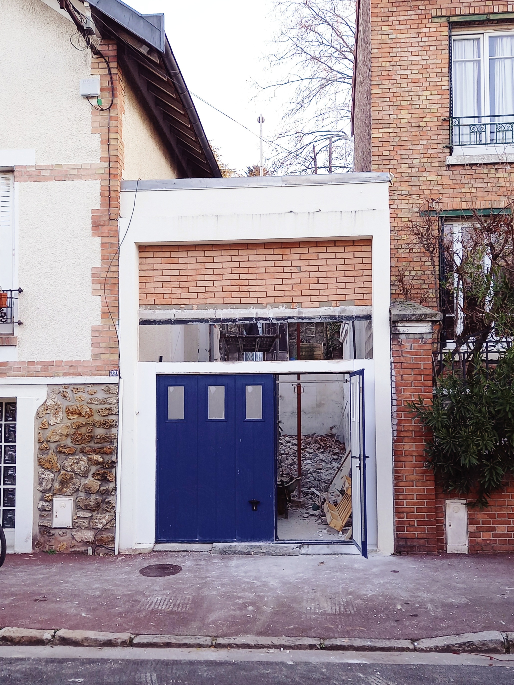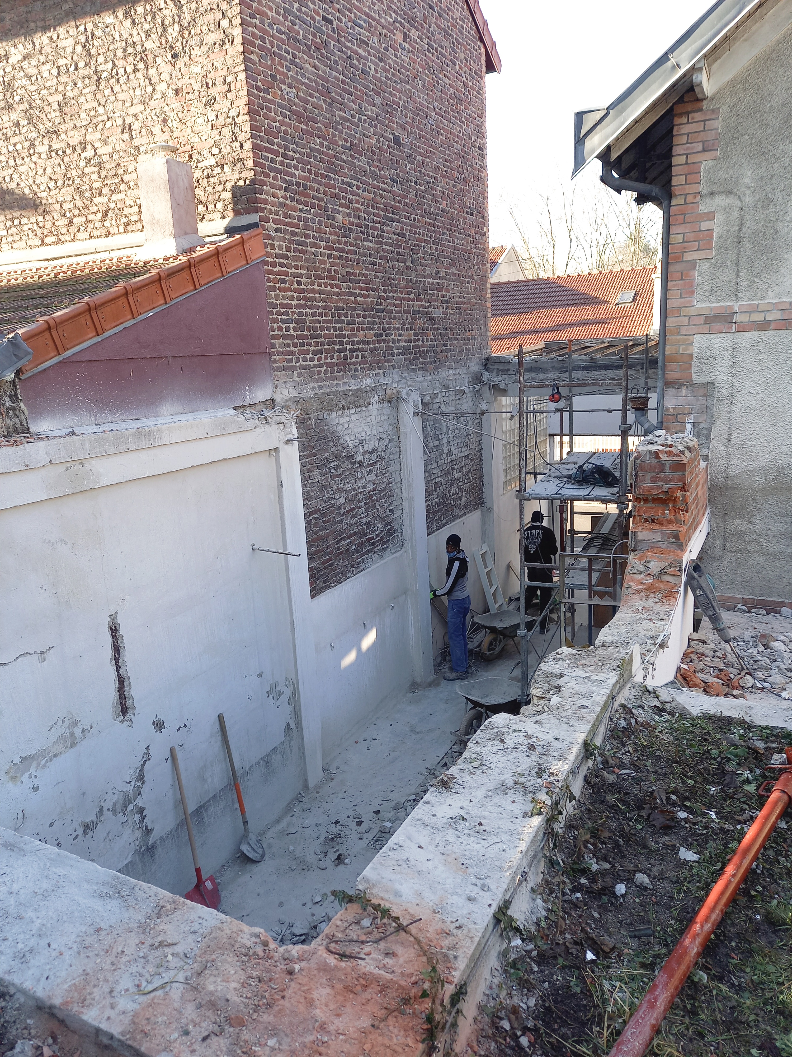 L'extension a la couleur rouille de l’acier Corten, en écho aux briques des constructions voisines. Édifiée en ossature bois, dans l’interstice laissé par la démolition d’un ancien garage et par le réemploi de sa structure poteau-poutre, l'extension permet de repenser l’organisation de la maison tout en augmentant sa surface habitable. La cour dessert un studio au RdC, l'extension devient l'entrée principale de la maison. La recherche de lumière, de liens et de nouveaux espaces s'est accompagnée d'un objectif de sobriété qui aura permis de diviser les besoins énergétiques de la maison par 2.