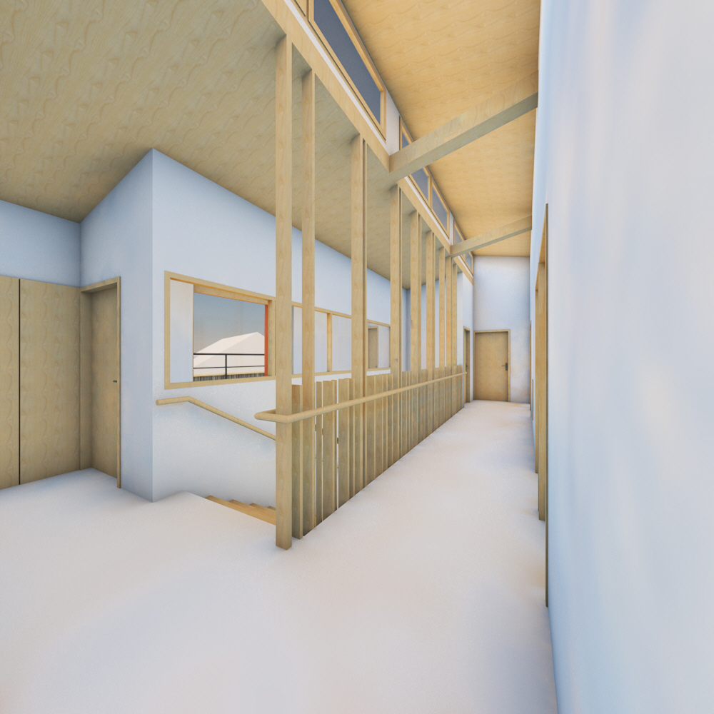 Descriptif technique : Façades ossature bois (modules 2D, préfabriqués hors site), bardage bois Charpente bois, couverture bac acier et toiture terrasse végétalisée Fenêtres bois-alu avec ouvrants sécurisés de ventilation naturelle Laine de bois dans l'épaisseur de l'ossature bois