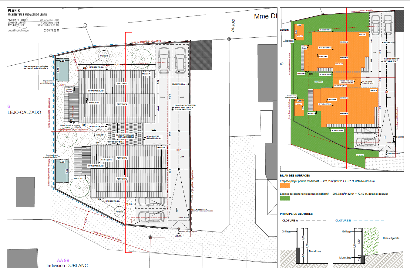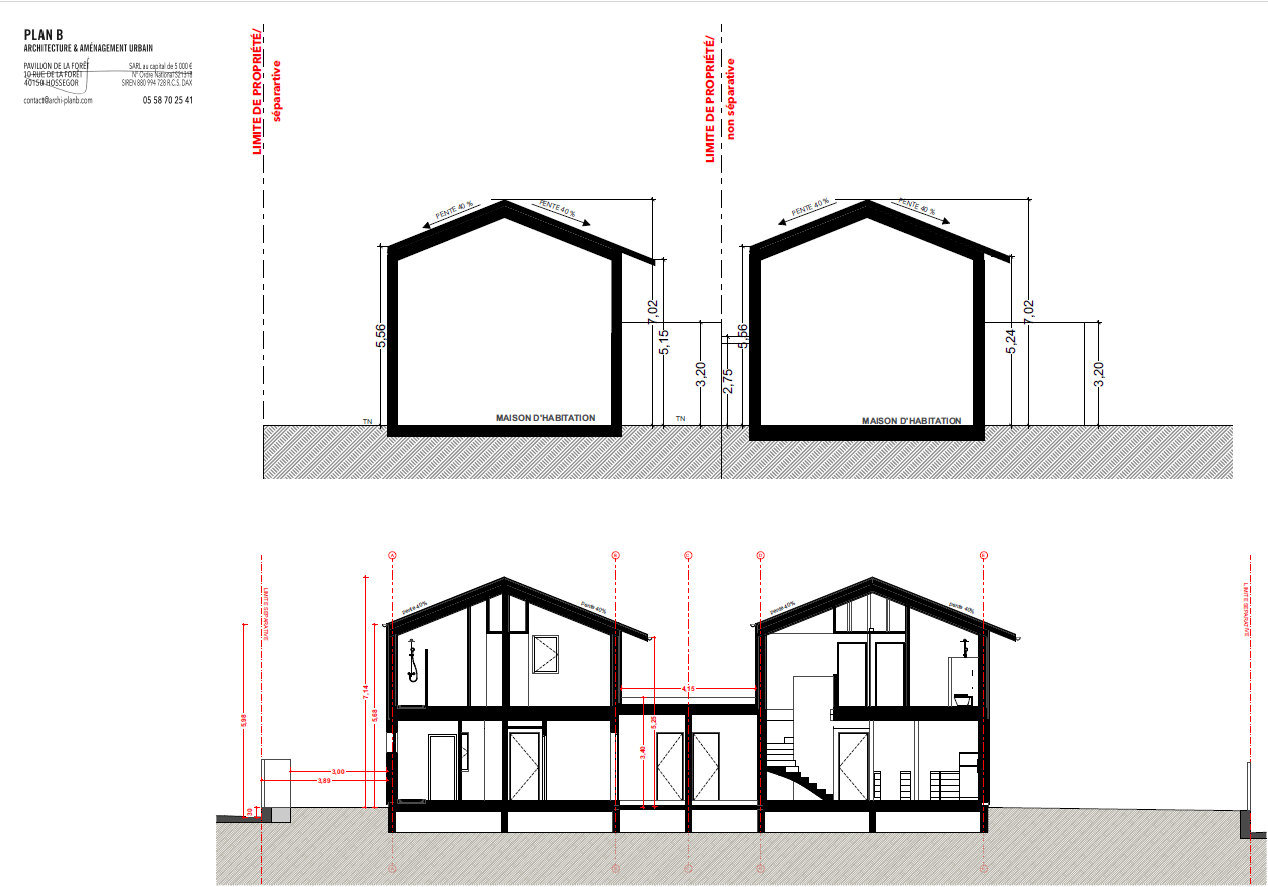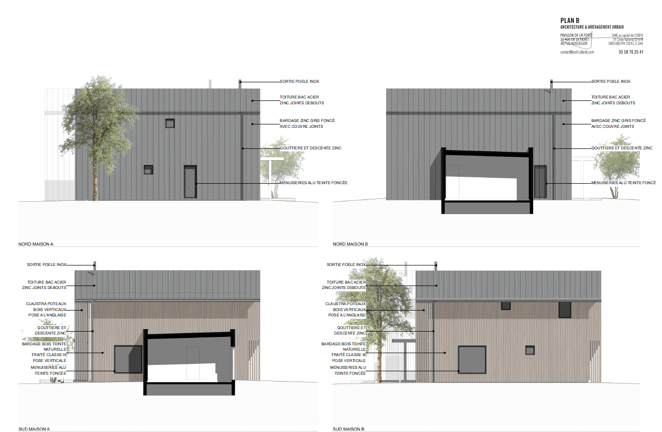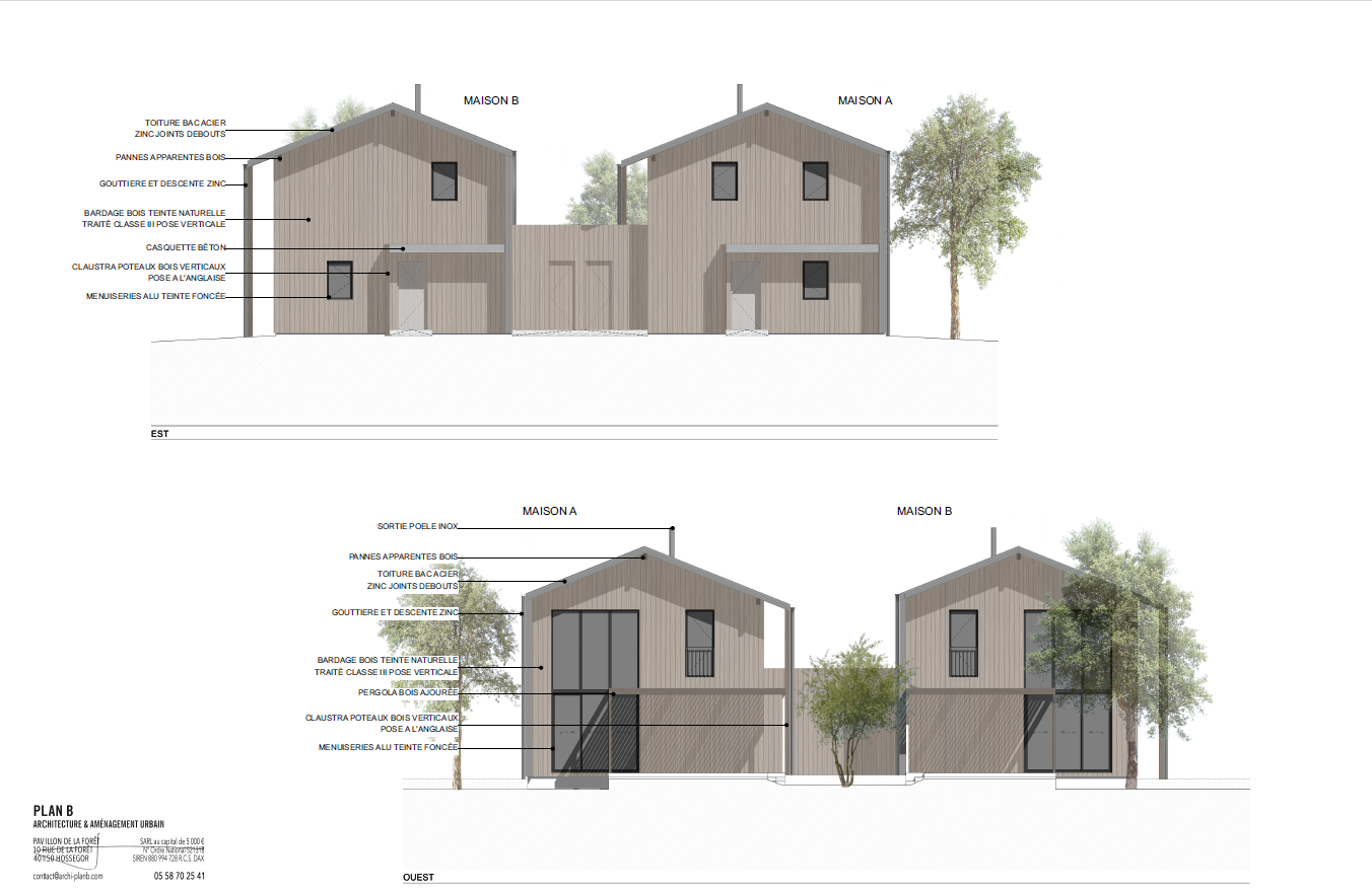 Construction de 2 maisons individuelles mitoyennes à Haute performance Energétique. Les maisons sont constituées d'un RDC et d'un R+1, bénéficient d'un jardin privatif avec terrasse bois, piscine et de 2 stationnements. Bardage métallique (sur 1 face) et bois de teinte naturelle posé verticalement (sur 3 faces). Bandeaux, sous-faces des avant-toits, encadrements de fenêtres en bois traité avec un vernis mat naturel. Rives, gouttières et descentes en zinc naturel. La couverture est en métal et les menuiseries en alu de teinte foncée. La porte d'entrée est en bois de teinte naturelle.