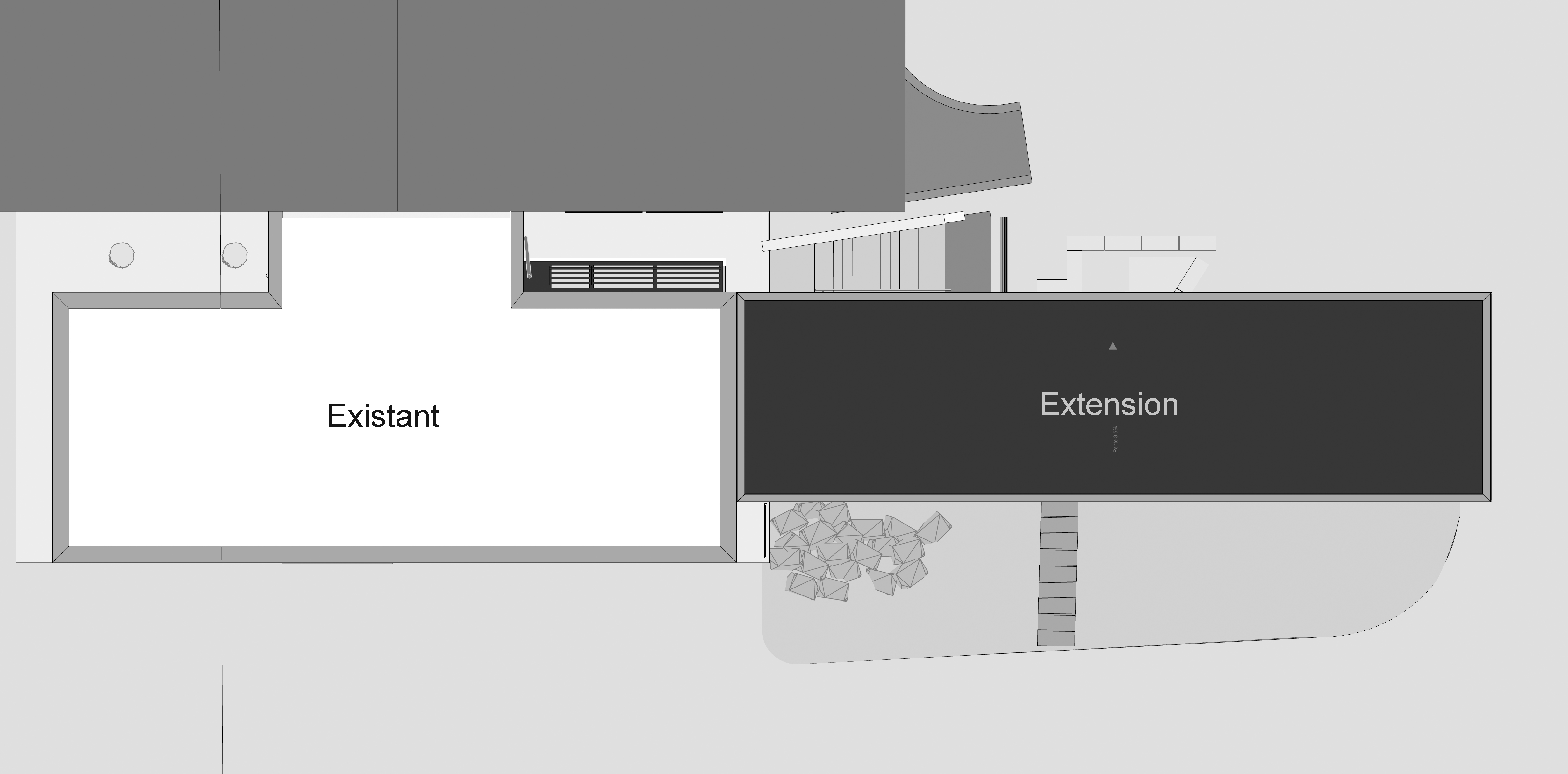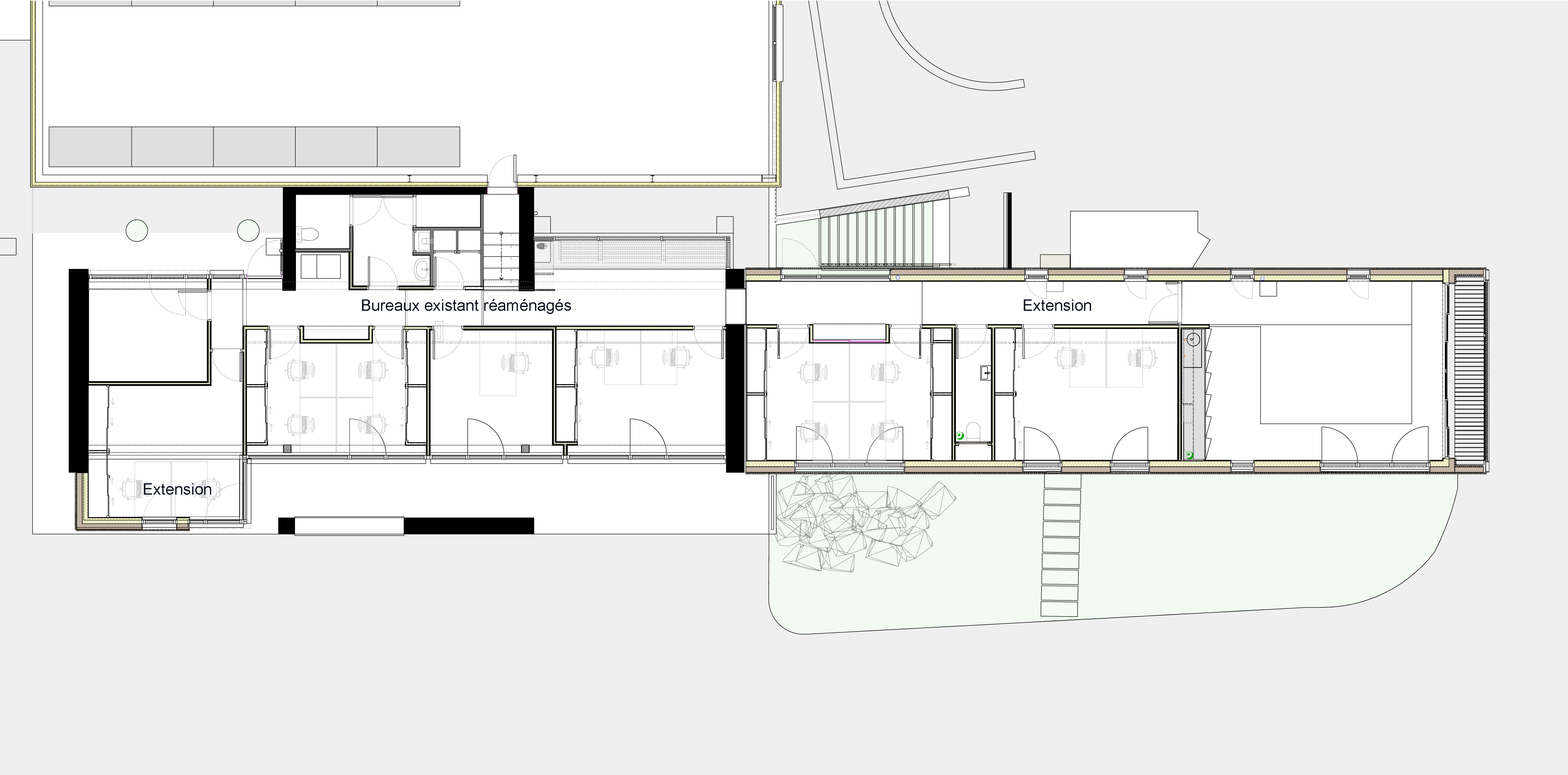Initialement pensé pour le maitre d’ouvrage en R+1, notre équipe MG+ avons proposé d''inscrire l'extension dans le prolongement du bâti existant en RDC et dans une continuité de fonctionnement des bureaux. Le projet s’inscrit alors dans la morphologique du bâti où l'ossature bois donne dans l’extension les termes d’une nouvelle identité architecturale. Le choix des tasseaux ajourés en bardage jouent sur des effets de vibrations et de transparences protégeant et dissimulant les ouvertures. En pignon, une large baie termine notre intervention offrant une vue panoramique sur le coteau .