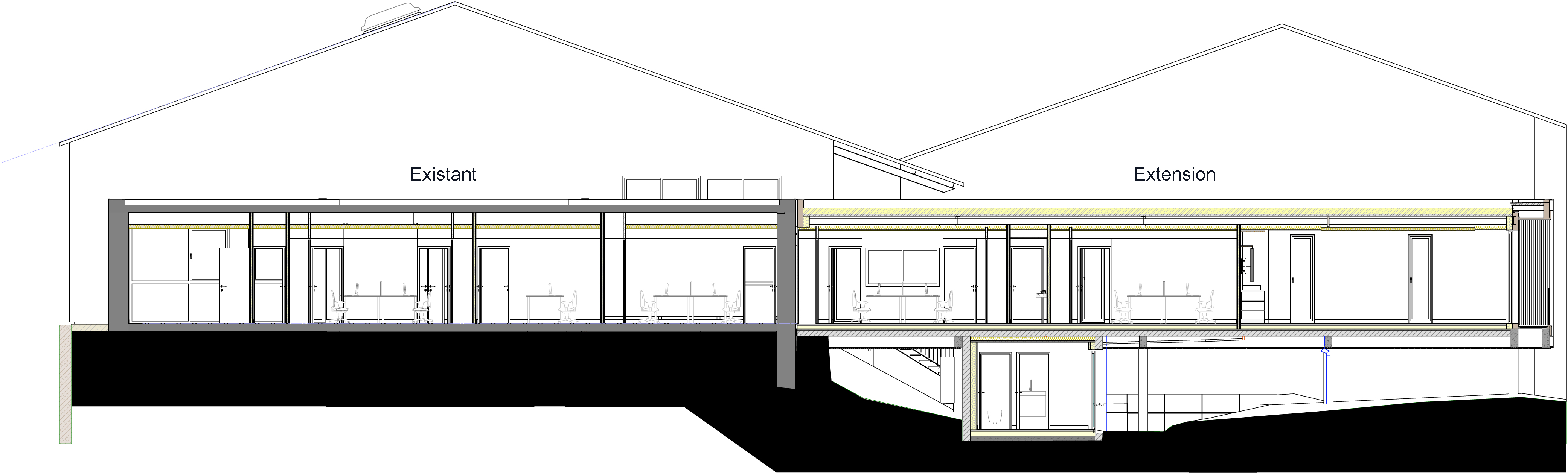 Descriptif technique : Fondations par pieux, structure poteaux poutres et plancher béton Ossature et structure bois compris toiture avec étanchéité / cadre métallique de contreventement en pignon / Bardage tasseaux bois sur les 3 faces du projet murs ext. et sous face plancher (plénum technique) / Serrurerie: escalier métal Galva d'accès chauffeurs / Garde corps verre pour la petite terrasse ext. / Menuiserie Alu (pour une cohérence visuelle avec l'existant) / Second Œuvre par doublage et cloisons placo / Menuiserie int. bois compris agencement / Chauffage et refroidissement par PAC (A/A) / Elec: raccordement sur l'existant / Eclairage par laids / VRD: terrassement simple et reprise voirie limitée