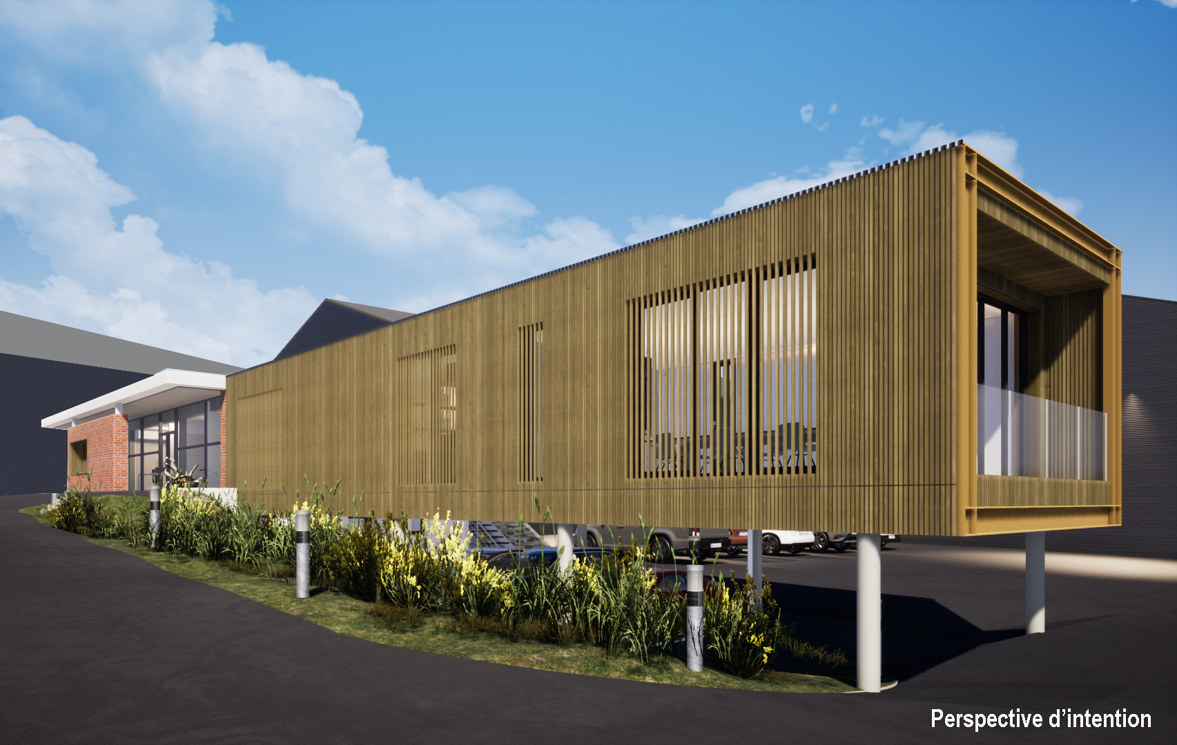 Approche environnementale : Suite aux besoins d'ancrage par pieux "pilotis" et plancher béton, construire en ossature bois accompagnait le souhait du MO de travailler sur un impact environnemental maîtriser. Ce choix s’est avérée cruciale sur le gain de temps de mise en œuvre et pour un impact de chantier propre rapide, avec une consommation d'eau et d' énergie moindre. Le projet a été pensé de manière à être le moins envahissant dans un environnement construit aux infrastructures déjà en place. Minimisant l'assiette des travaux, les reprises de voiries, et une technicité constructive simple : donc vertueuse.