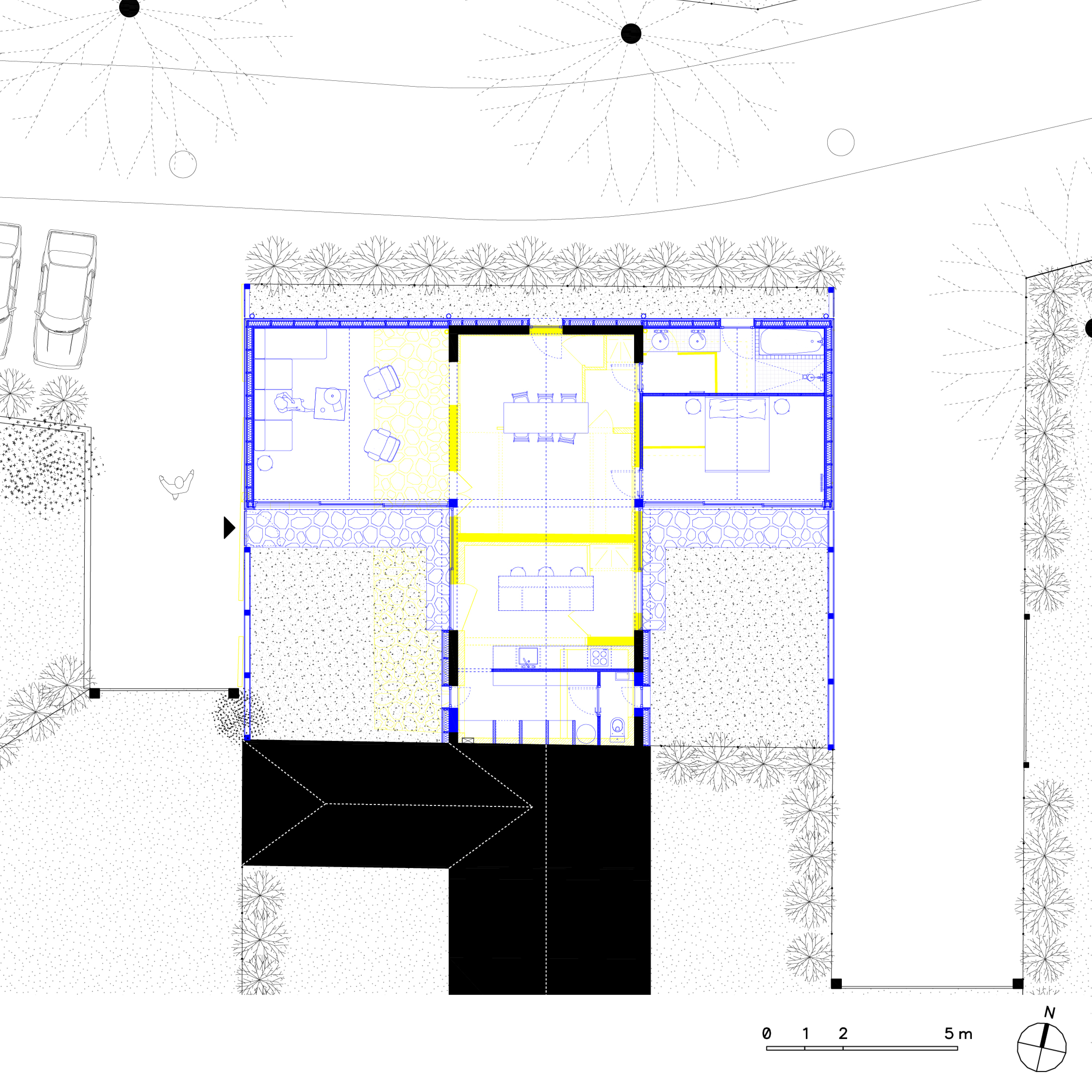 Approche environnementale : Les extensions sont réalisées en ossature bois et bardage vertical. L'ossature bois se prolonge autour du volume existant pour l'isoler par l'extérieur et unifier l’ensemble des façades et des clôtures de la construction. Toutes les pièces du logement sont largement ouvertes sur l'extérieur pour permettre un bon éclairage naturel et bénéficier d'apports solaires généreux. Les profondeurs de bâti développés sont faibles (5m) et toutes traversantes de manière à pouvoir développer la ventilation naturelle du logement. Une ventilation simple flux est posée en appoint dans les pièces humides.