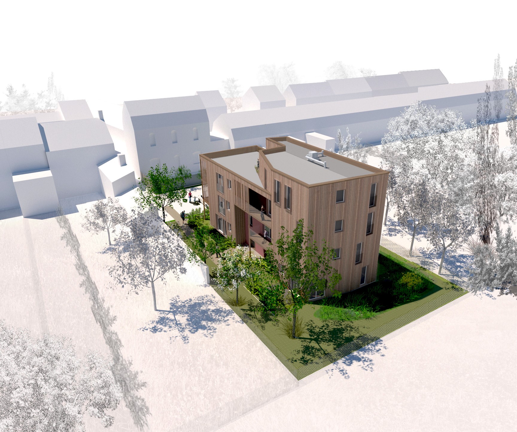 Le projet adoptant une esthétique contemporaine, comprend 7 logements collectifs en ossature bois, et un parking aérien de 9 places. La forme longitudinale du bâtiment, avec une gradation en R+2 et R+3 selon le côté, permet une transition plus douce avec les gabarits des maisons voisines en bandes du quartier. Ce geste architectural, offre des volumes dynamiques s'intégrant harmonieusement dans le paysage environnant. La structure permet diverses typologies de logements traversants, avec triple orientation et vue panoramique, depuis les balcons et terrasses dont bénéficient les habitants.