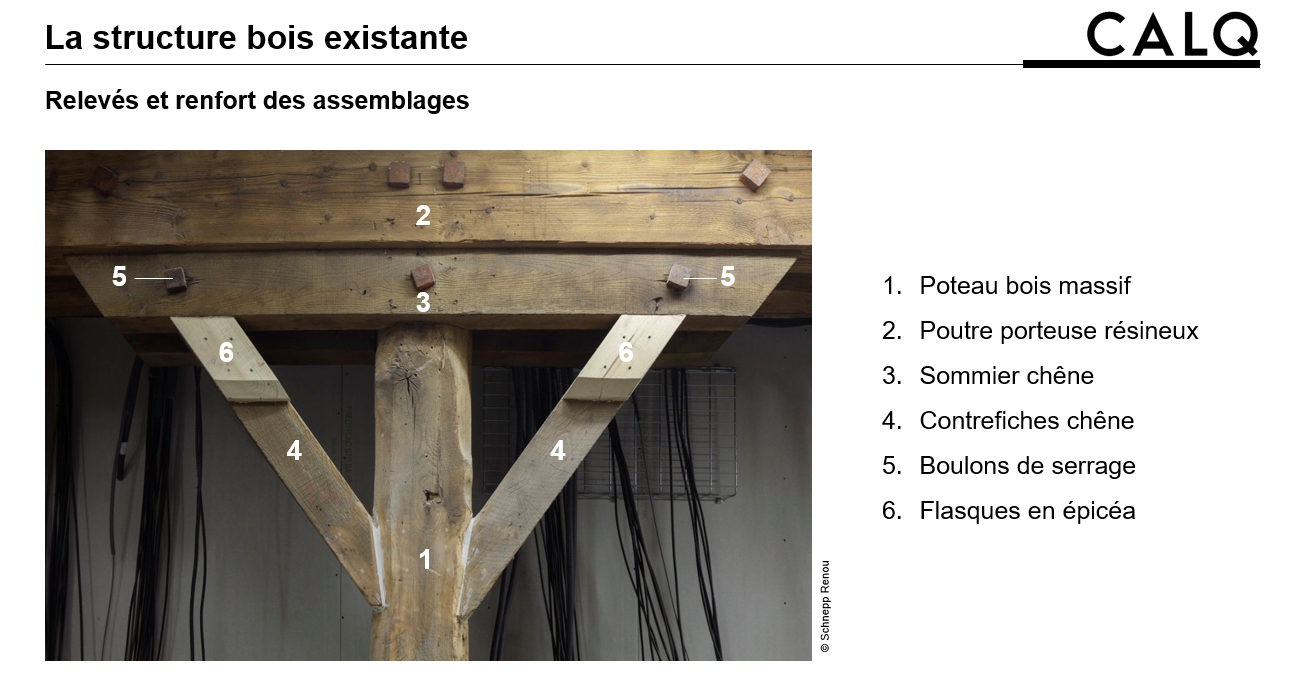 Descriptif technique : Défi du changement de destination de l’immeuble (et donc des charges) et de la mise aux normes en conservant les structures existantes. Réhabilitation : l’assemblage existant entre les poutres porteuses moisées et les poteaux est assuré par l’intermédiaire d’un sommier en chêne qui répartit les charges issues des poutres porteuses. Il est complété par un boulon de serrage. Afin de conserver la qualité architecturale du bâti, renfort des structures existantes par injection de la résine en combinaison avec des fixations mécaniques (pose de flasques en épicéa vissées collées à la résine époxy). La stabilité au feu de la charpente est assurée soit par augmentation des zones d’appuis des poutres et sommiers sur les éléments verticaux, soit par renforcement avec des tiges filetées.