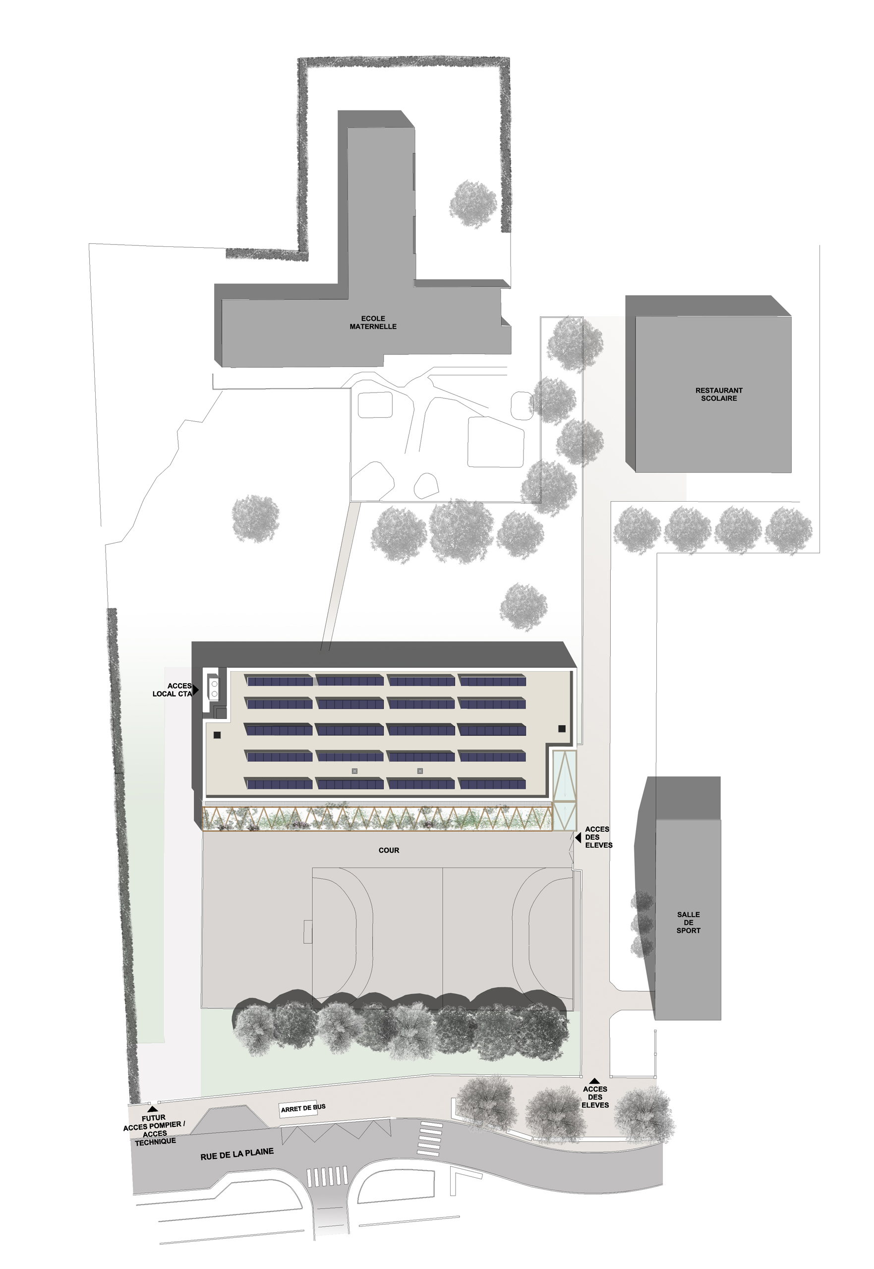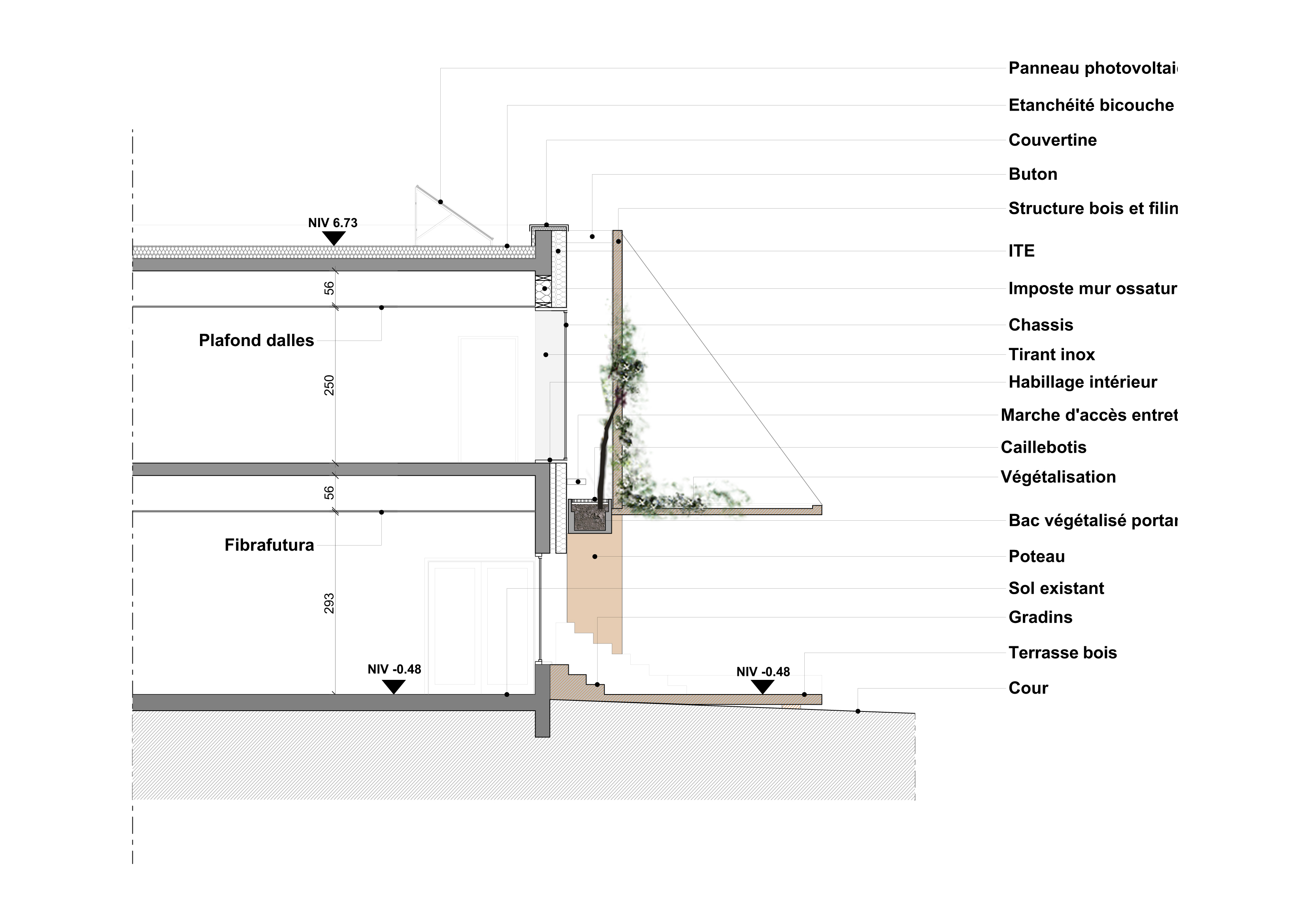 Nous proposons de constituer la façade végétale à base de plantes grimpantes. Ces végétaux permettent une gestion plus économe en termes de consommation d'eau et de maintenance technique contrairement à un système de plantation verticale potentiellement plus délicat et rigoureux à entretenir. La structure en épaisseur offre une biodiversité plus large : c'est un support pour des plantes avec leur floraisons et fructifications, mais également un support plus favorable pour les insectes et les oiseaux. L'arrosage est assuré gravitairement par des cuves de récupération d'eaux pluviales.