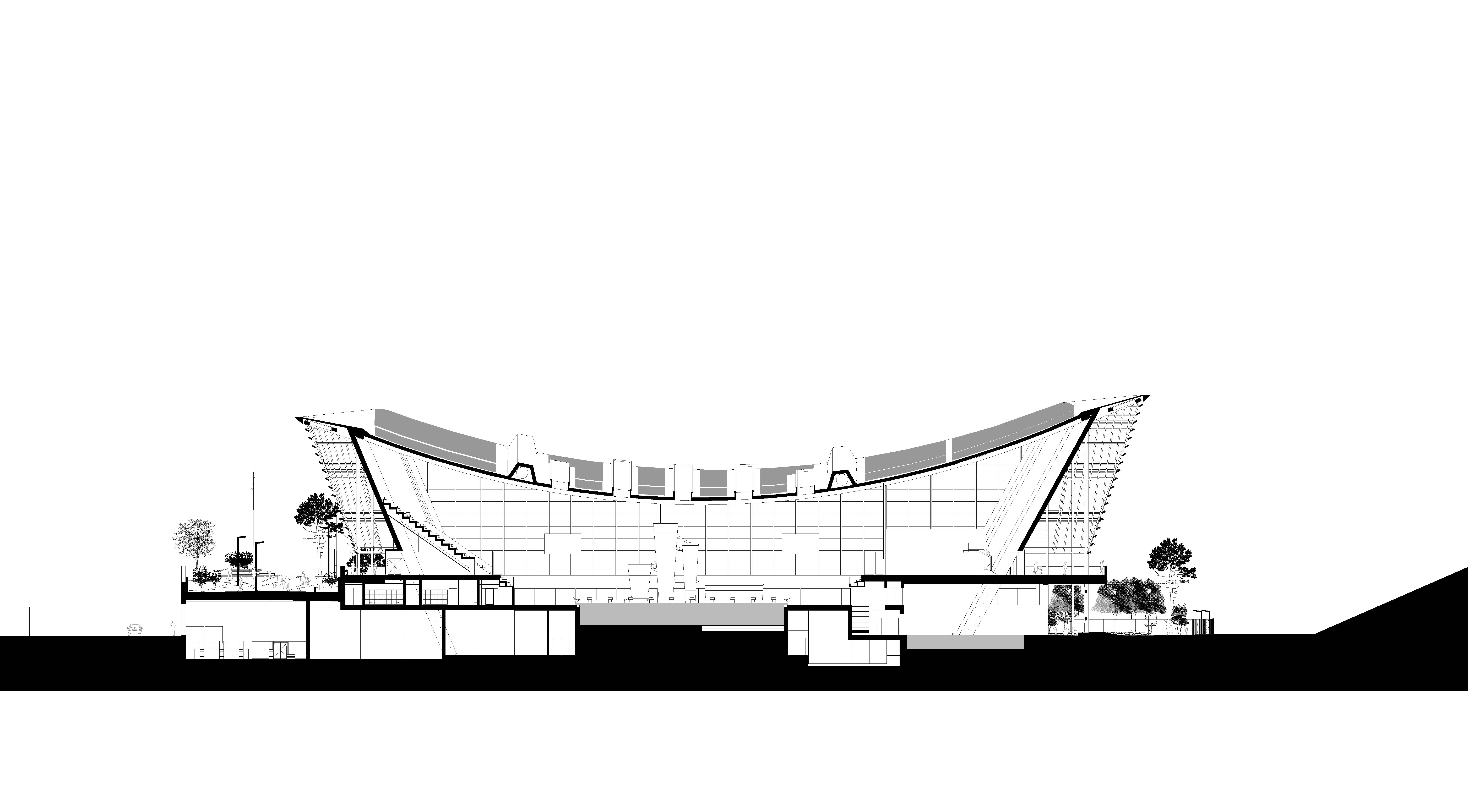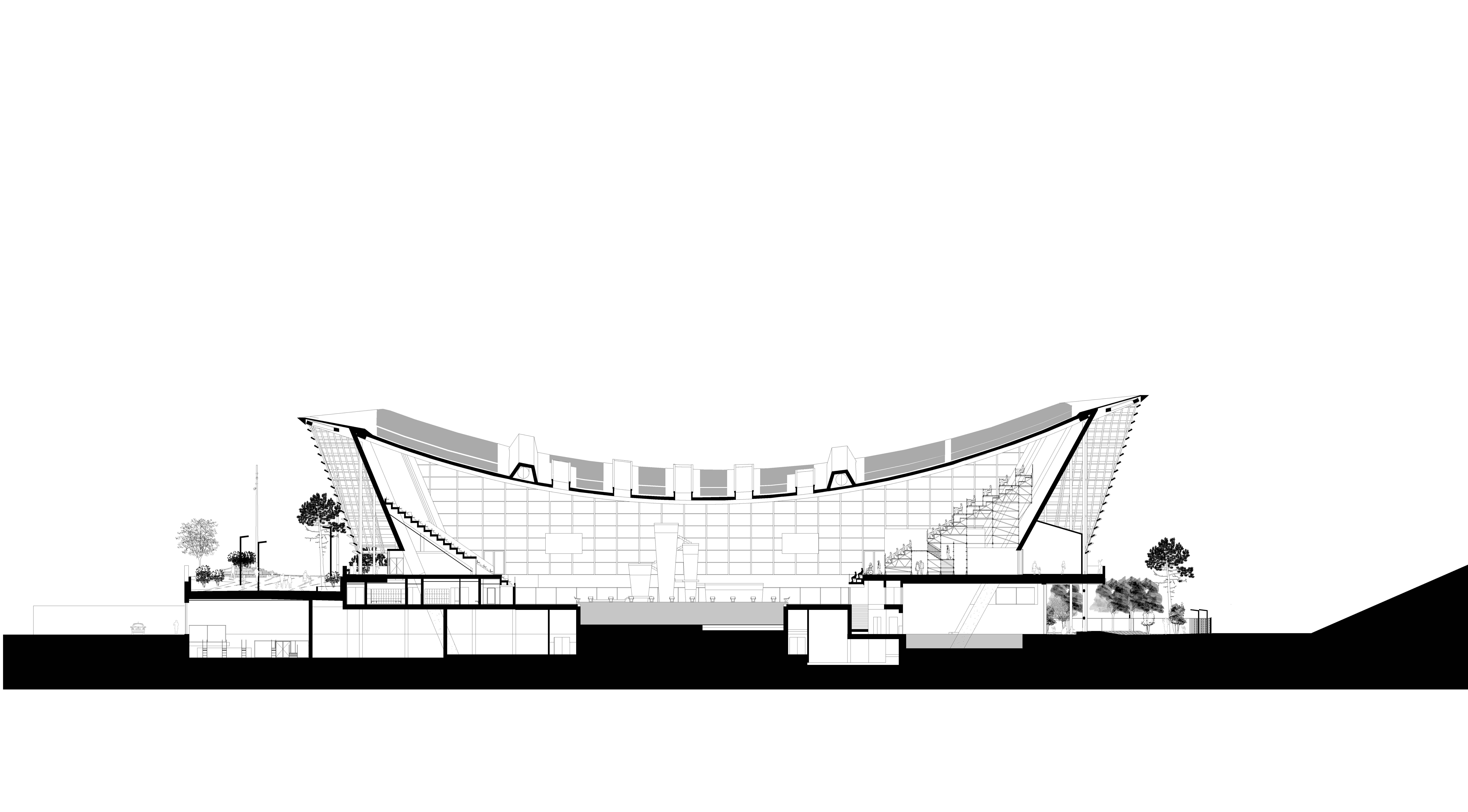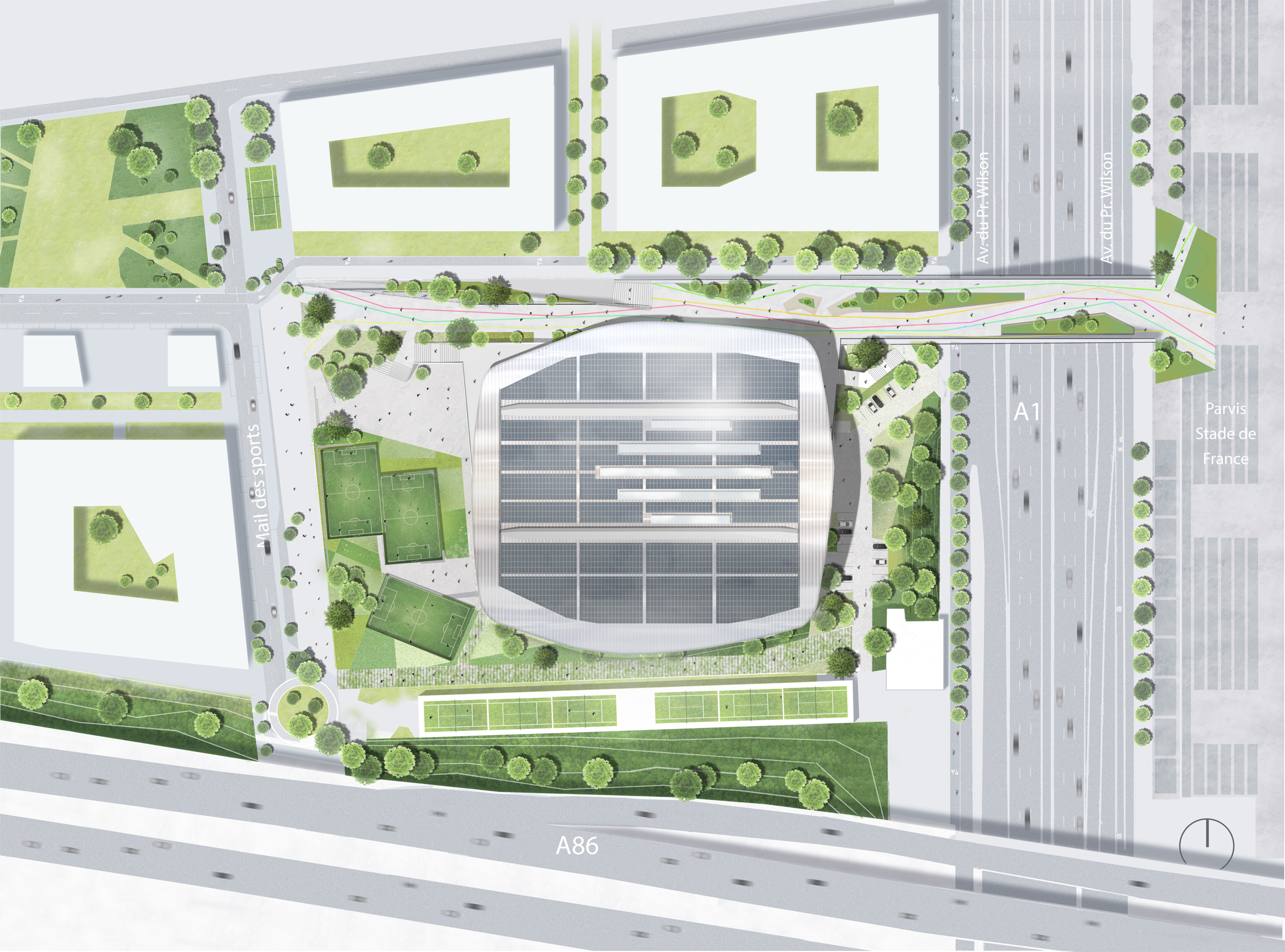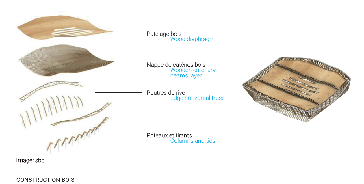 Descriptif technique : Le squelette de la structure participe à l'architecture du lieu. Les qualités structurelles du bois répondent aux efforts de compression et de traction requis par les 90 catènes de la toiture incurvée, mesurant chacune 55cm d'épaisseur avec une portée de 85m environ, suspendues tous les mètres, sans faux plafond et utilisation de matériaux superflus. Des poteaux tirants primaires et secondaires ont été placés tous les 10m. Ces propriétés ont permis de concevoir un volume compact, réduisant l’emprise au sol et le volume à chauffer. Les différents espaces mis en relation apparaissent plus grand qu’ils ne le sont et favorisent une intensité d’usages. Les sièges des tribunes fixes sont fabriqués en plastique 100% recyclé, sourcé localement. *Coût total = conception/construction/promotion