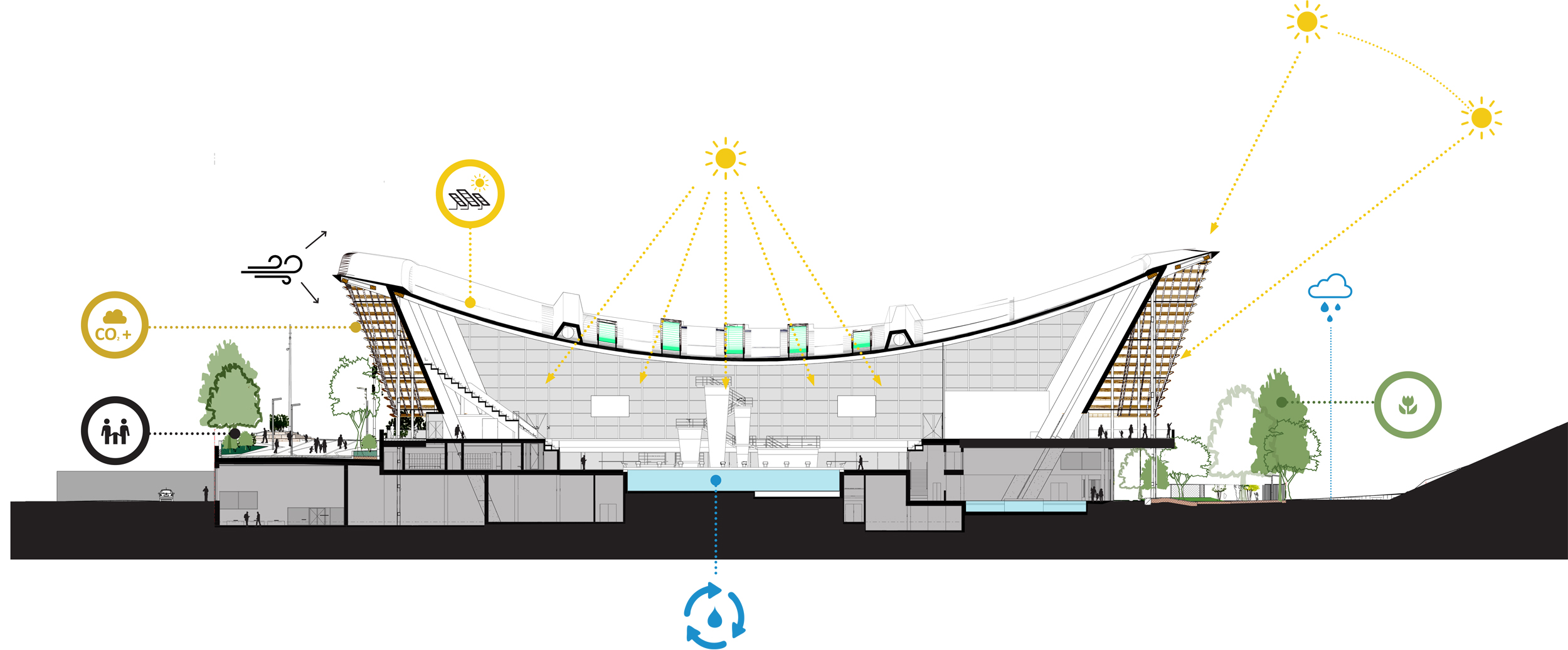 Approche environnementale : Par sa structure en bois et par le recours aux matériaux biosourcés et recyclés, le Centre aquatique souligne notre engagement en faveur d’une utilisation intelligente des ressources disponibles fondée sur leur capacité à absorber et à contenir les émissions de CO2, mais également sur leur réversibilité et leur réutilisation à long terme. Moins consommer, mieux consommer pour plus de générosité : une philosophie de la juste mesure associée à une synergie d'innovations au service de la sobriété énergétique de l’arène, qui confirme nos hypothèses en matière de conception durable.