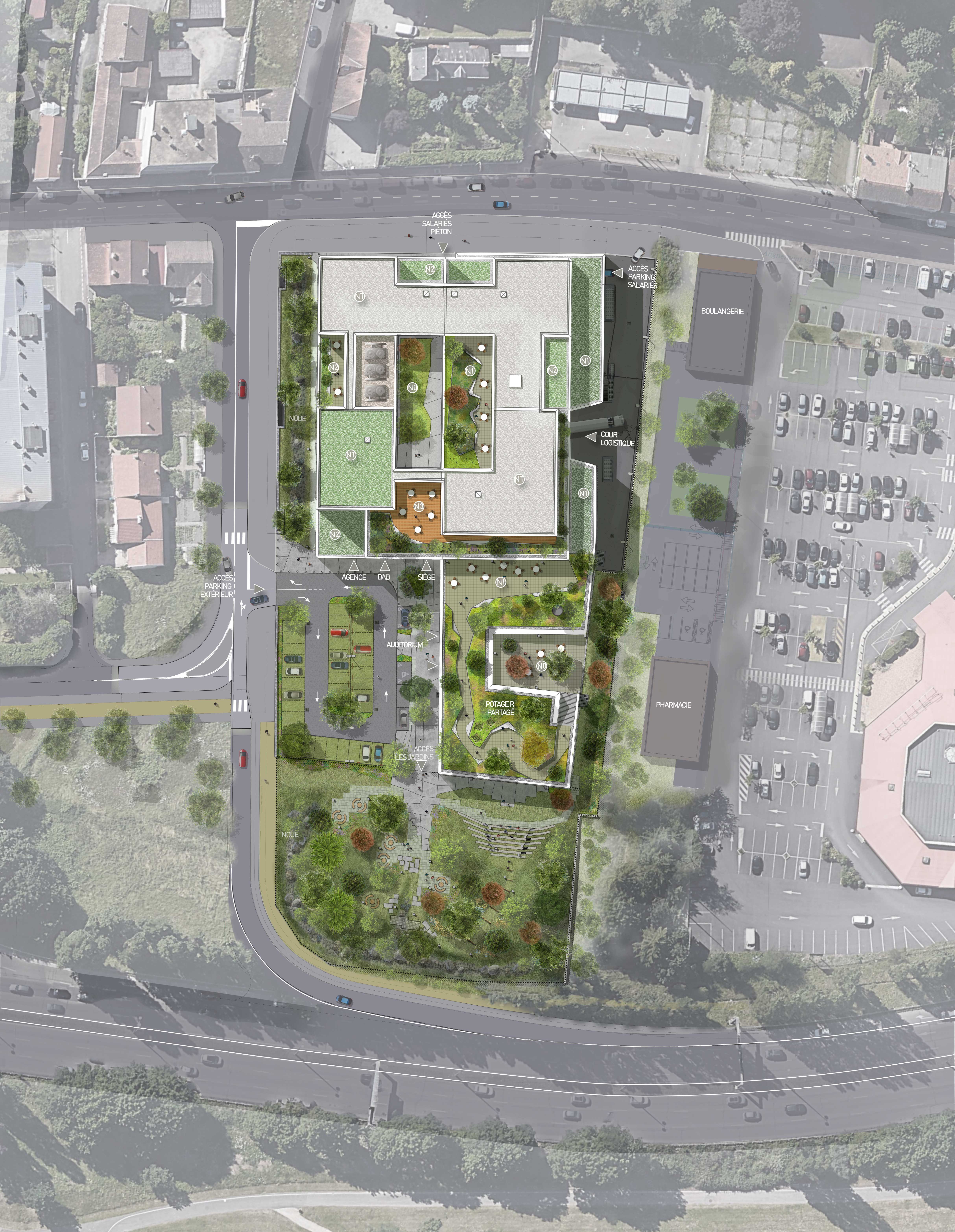 Approche environnementale : Des objectifs ambitieux ont été fixés par le maître d'ouvrage : - Certification HQE Exceptionnel - Label E+C- (E2C1) La conception a été guidée par ces objectifs et intègre : - 100 % de bois de structure local (du Limousin) : poteaux-poutres, planchers mixtes bois-béton - le recours à 900 m² de plancher technique de réemploi - la récupération des eaux pluviales de toiture pour alimenter WC et arrosage (50% des besoins sanitaires couverts) - des espaces extérieurs stimulant la biodiversité : plus de 2 000 m² de parc paysager, 50 arbres plantés, un potager collectif en toiture, des nichoirs.