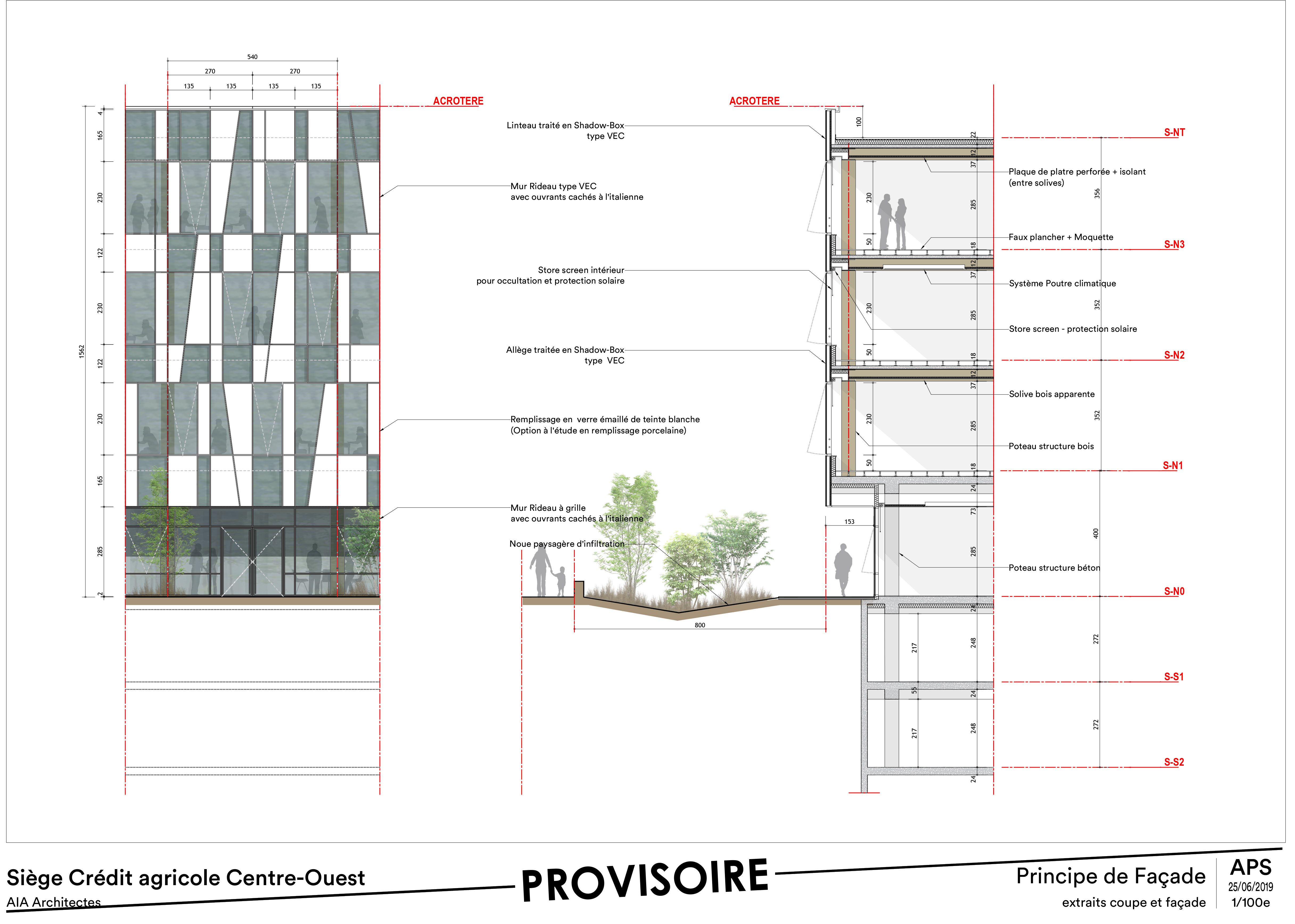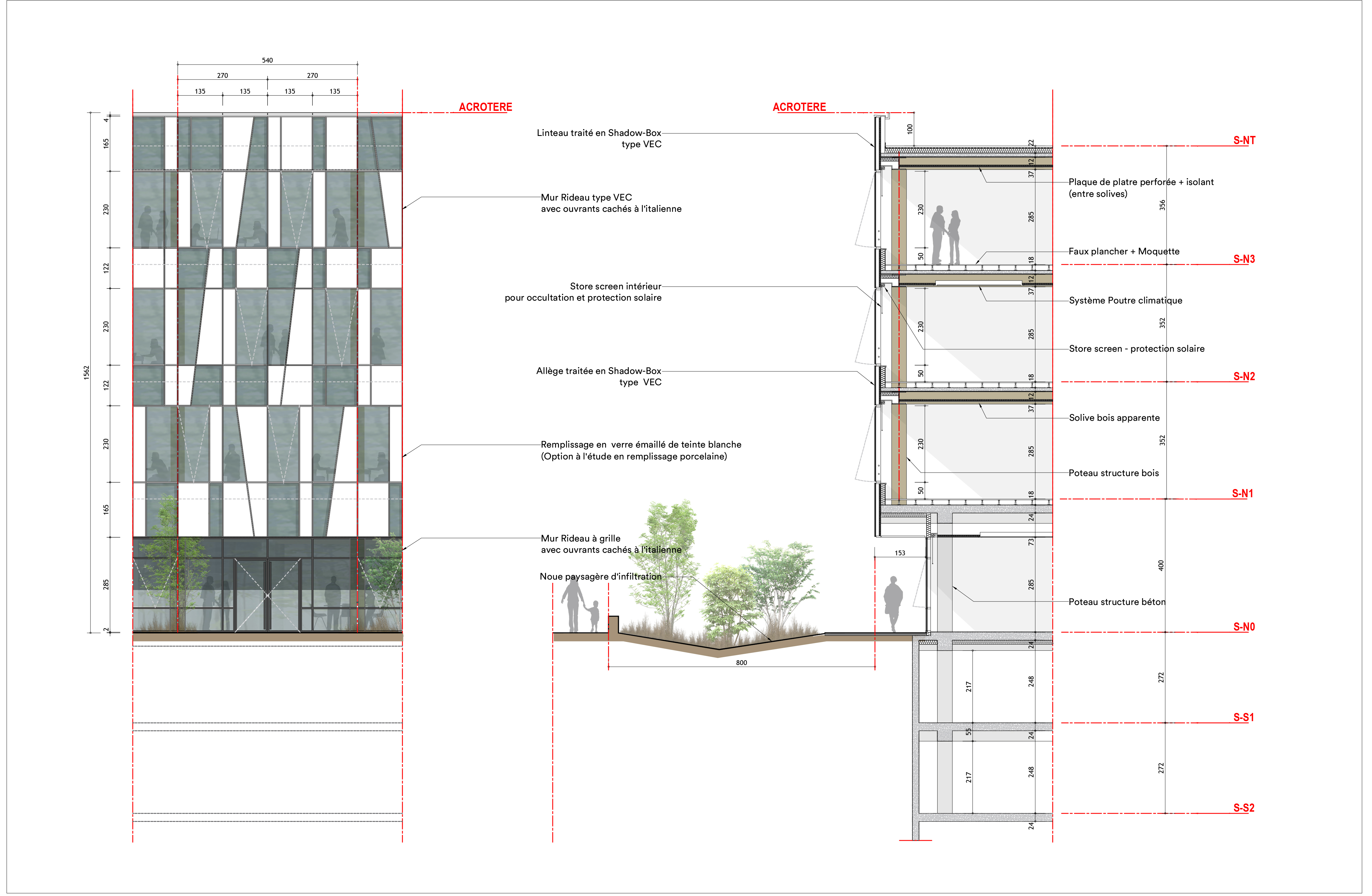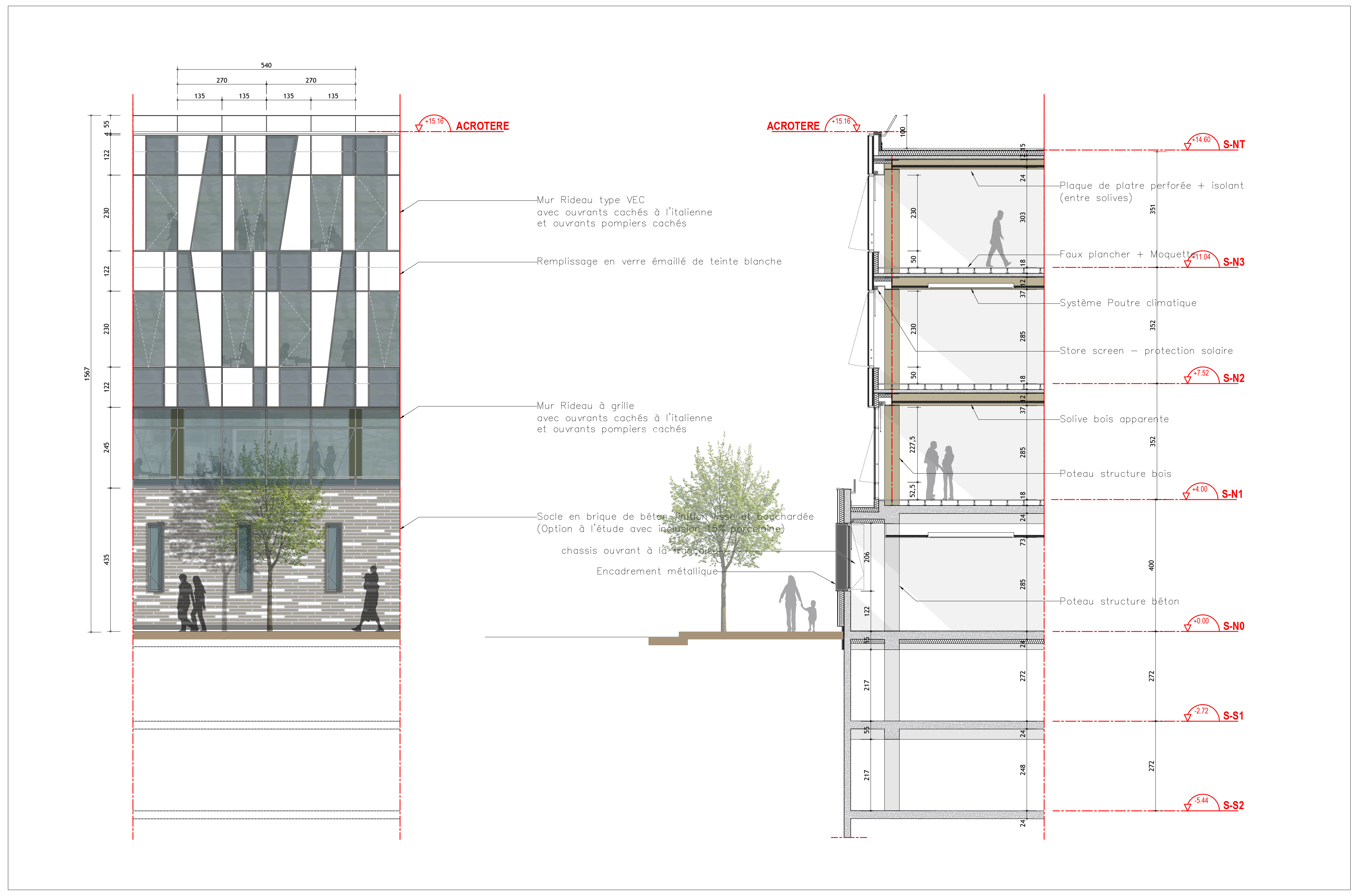 Descriptif technique : Le bon matériau au bon endroit Le bâtiment est constitué d’un socle en structure béton bas carbone (CEMII) afin d’assurer la pérennité de l’ouvrage. Il est surmonté de trois niveaux en structure mixte bois/béton, composée d’un système poteau/poutre en douglas suivant une trame de 5.40m et de solives bois, support d’une dalle béton connectée de 12cm. Le bois structurel visible dans les espaces de travail apporte une ambiance chaleureuse alors que le plancher béton apporte à la fois le traitement acoustique nécessaire entre les étages de bureaux et une inertie utile à leur traitement thermique. Ces espaces sont chauffés et rafraichis par des poutres climatiques disposées entre solives. Qui sont alimentées par deux pompes à chaleur air/eau réversibles.
