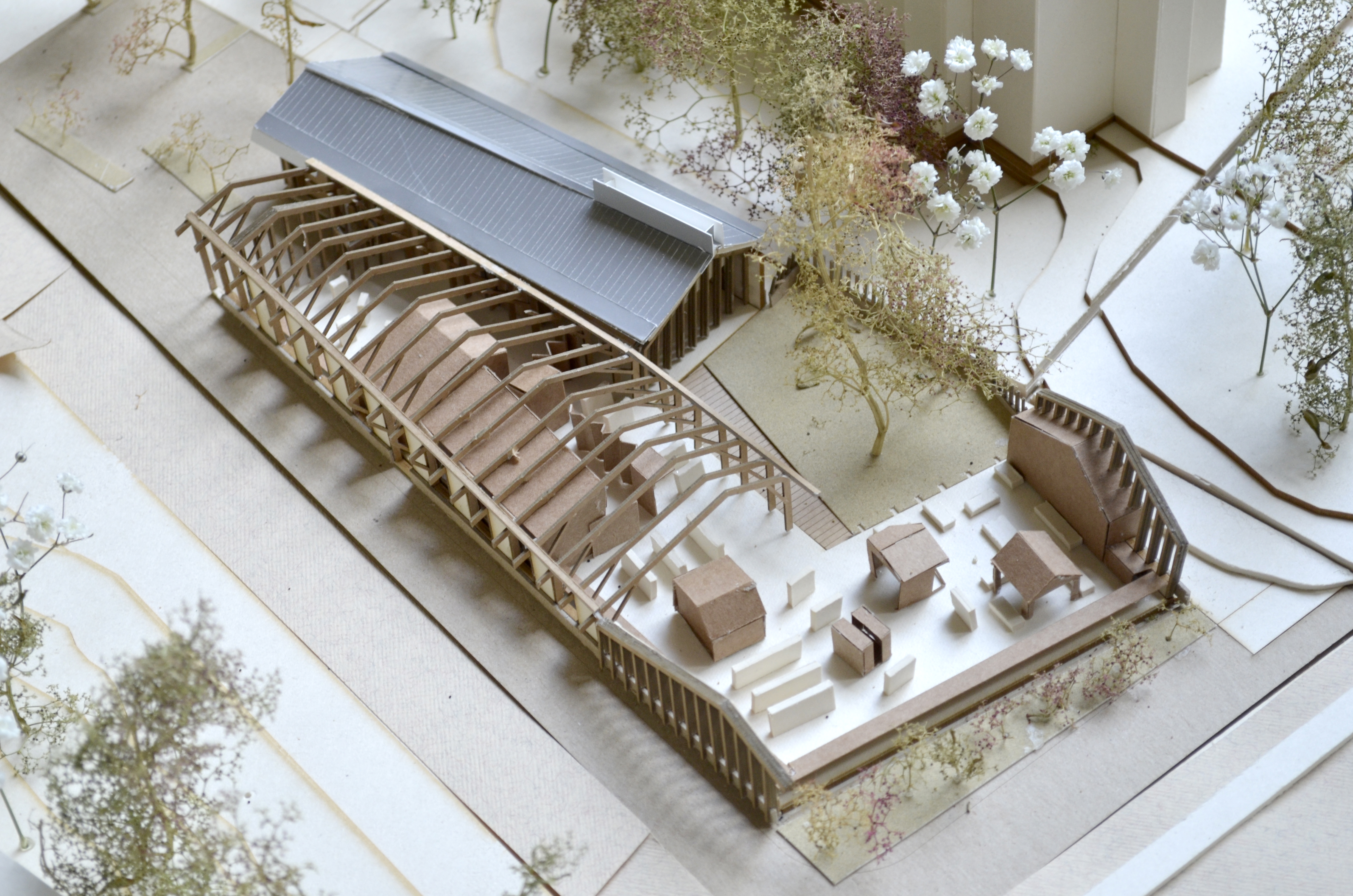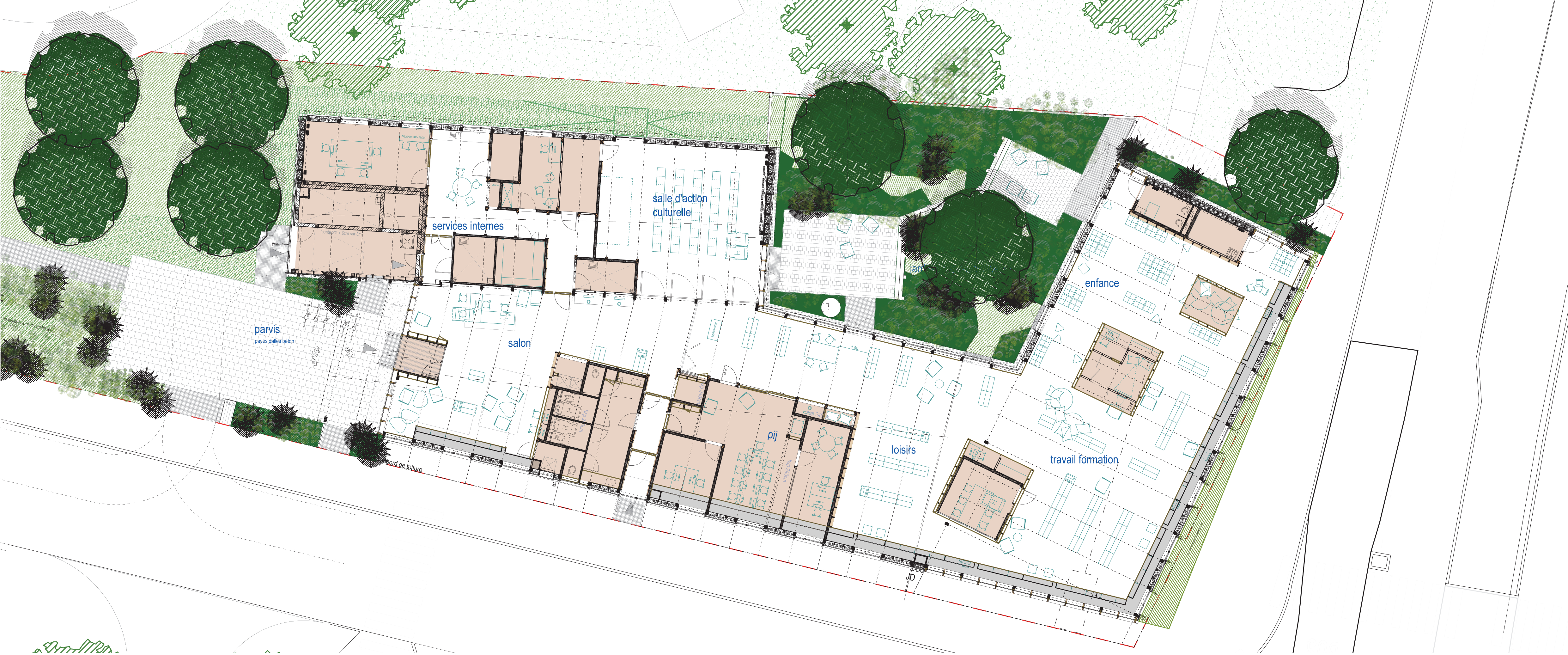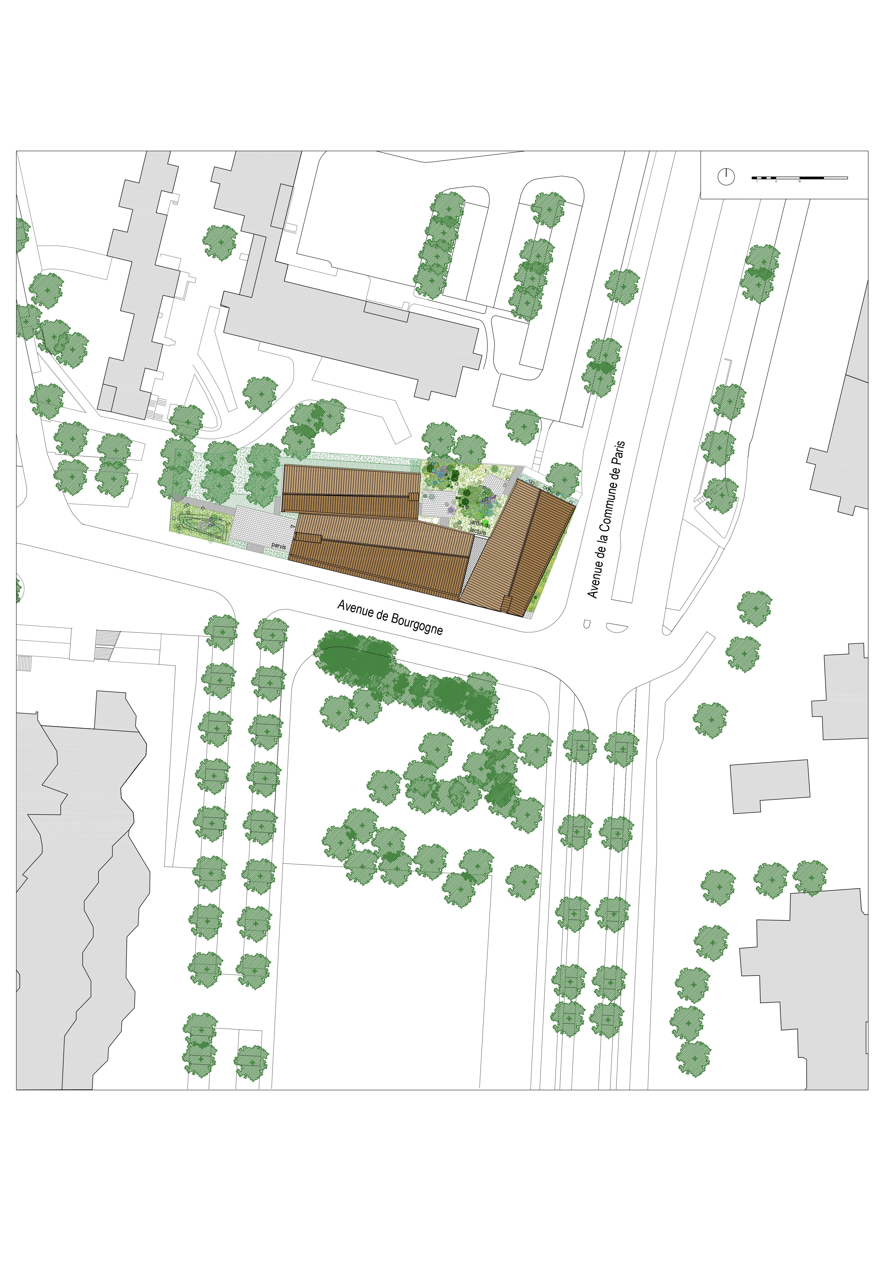 La médiathèque est bâtie dans un univers typique des années 70 fait de barres et de tours face à l’hyperstructure monumentale des ‘Coursives’. Elle s’insère dans ce paysage, adouci par une structure arborée cinquantenaire. Le projet prend le contrepied de ce cadre bâti et présente trois halles recouvertes de toits en pentes. Cette typologie d’apparence simple cache une riche spatialité intérieure. La médiathèque n’est plus seulement un lieu d’étude mais aussi un lieu convivial, créateur de lien social. Elle offre un jardin de lecture, un lieu dédié aux consoles de jeu, une salle culturelle,...