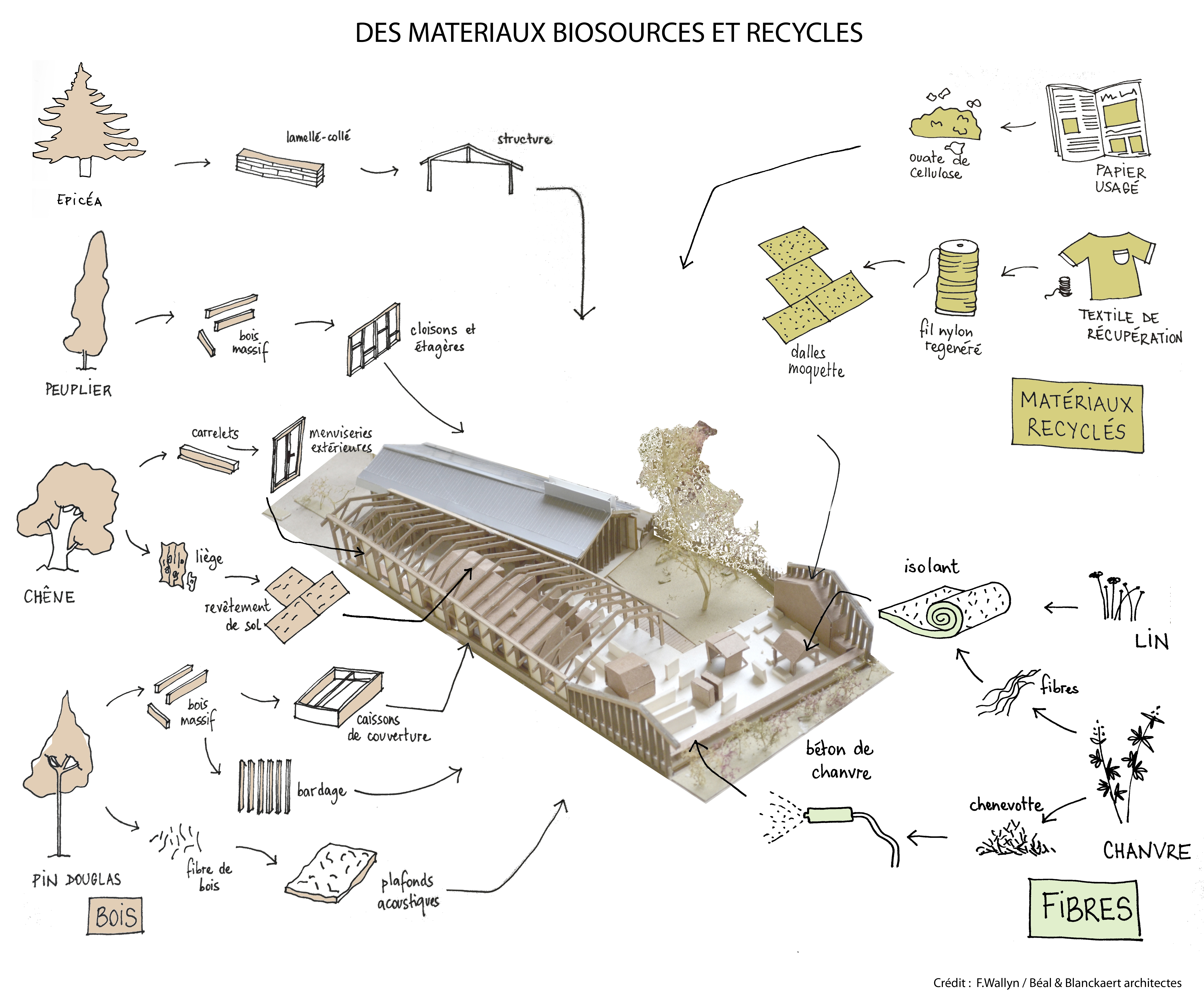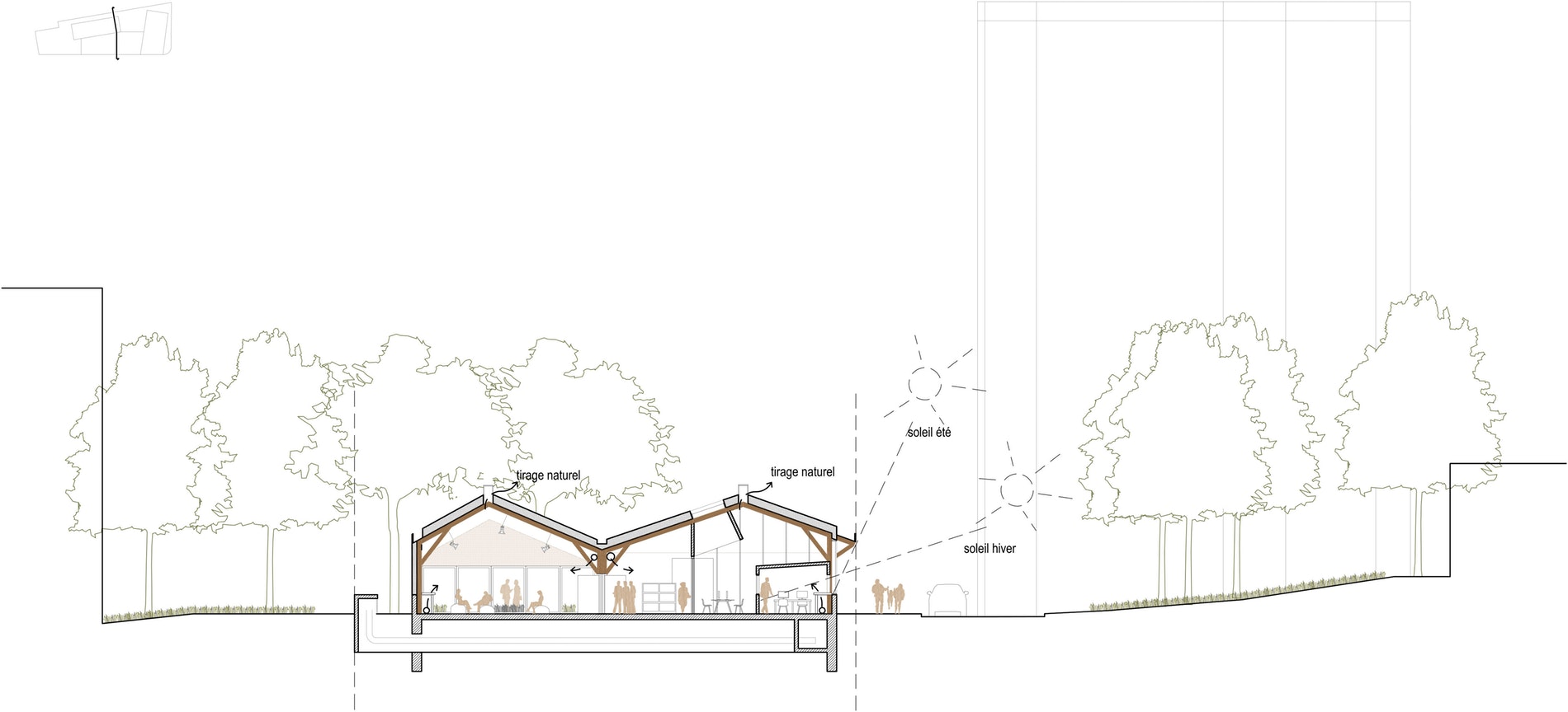 Approche environnementale : Conception bioclimatique, pragmatique, frugale -Bâti compact, débord de toit, espaces traversants, protections solaires mobiles, arbres conservés Recours au biosourcé + réemploi -Charpente et plafond en caissons bois, remplissage façade béton de chanvre, enduit chaux-sable, menuiseries chêne picard - textile de récupération, dalles moquettes recyclées Géothermie -Puits climatique Ventilation naturelle -tirage thermique + cheminées d‘extraction Enveloppe performante - besoin energétique réduit - confort: juin 2023, 21° sans climatisation, quand la température ext dépassait 30°C plusieurs jours