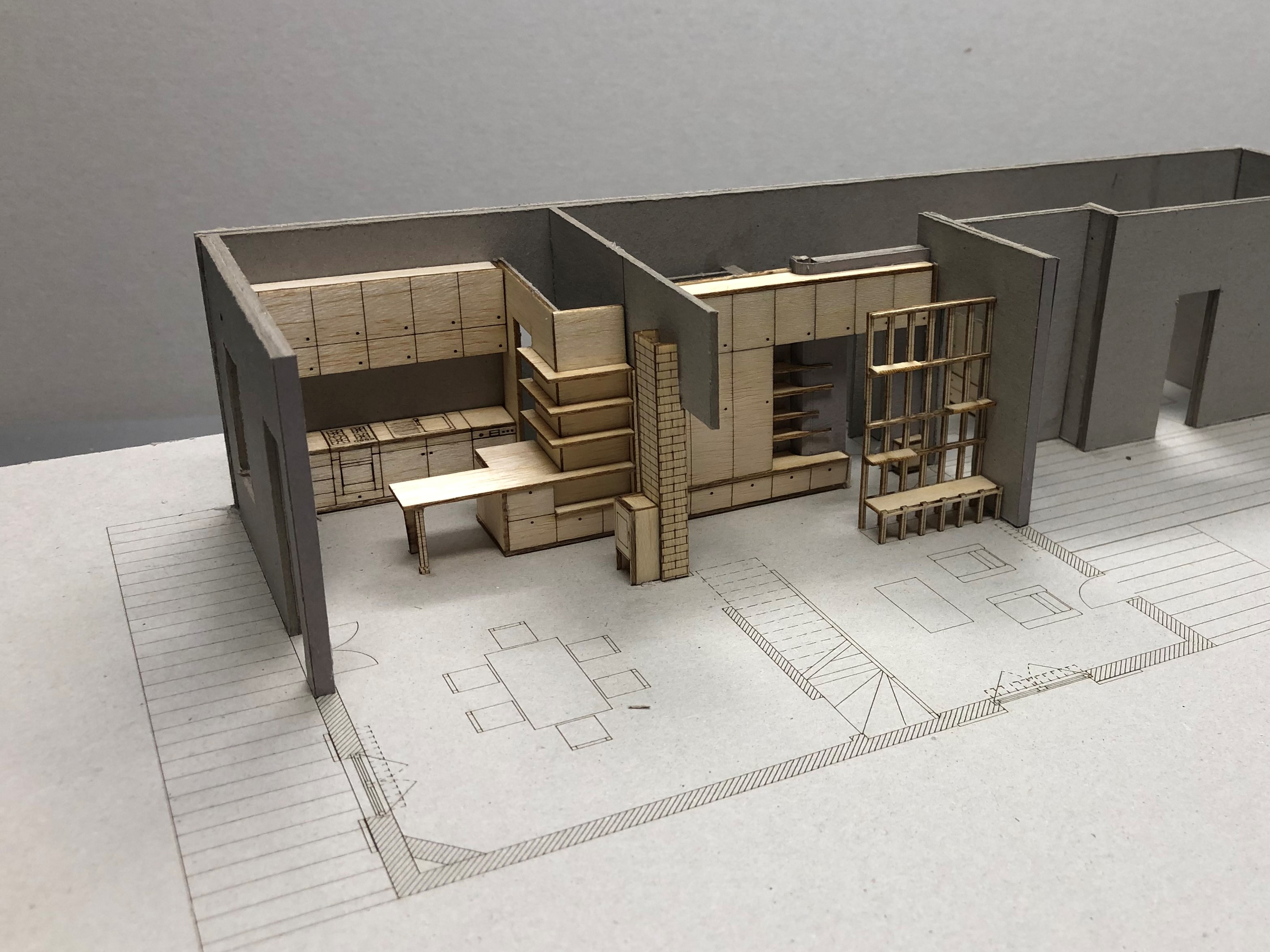 Descriptif technique de l'aménagement : L’espace de vue est conçu autour du poele permettant une bonne répartition de la chaleur dans la maison aussi bien au rdc qu’à l’étage tout en apportant une esthétique à l’intérieur. Un mur masse en brique de terre crue accompagne ce dispositif. Cuisine : CP bouleau 18mm / 15mm Plateau en Corian Piètements en hêtre Mobilier d’entrée et chambre : CP Bouleau 18/15mm CP peuplier (intérieur) Tasseaux de hêtre Sol : Sol en liège pose flottante