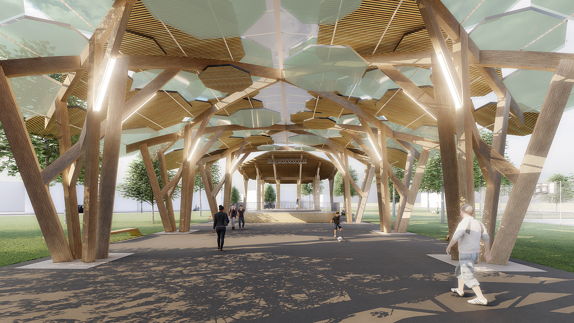 Conception d'une halle ouverte sur un terrain existant goudronné entouré d'un espace paysagé existant constitué d'aligements de platanes. la volonté architecturale était de réaliser un projet qui s'intègre parfaitement au paysage et aux arbres existant tout en étant assez imposant et remarcable pour épandre à la mairie de Boussens dont l'architecture des année 60-70 est particulièrement imposante. L'alliance du bois et du métal a permis une mise en oeuvre rapide ( 2 mois de chantier) et une architecture atypique, imaginée en continuité des arbres avoisinants.