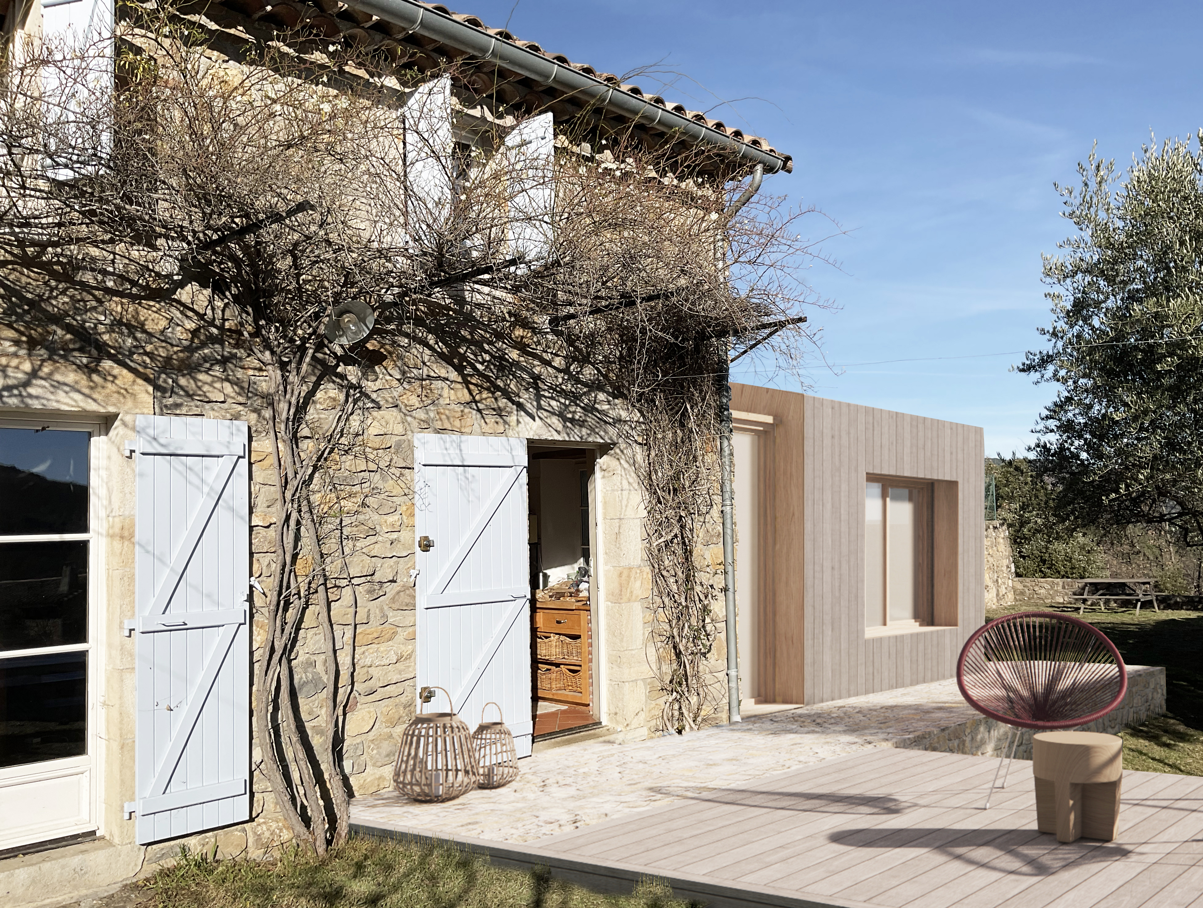 Approche environnementale : Le projet impacte peu le le terrain existant, et vient se "poser" sur le terrain existant. Son approche environnementale se concentre principalement sur : - le choix des matériaux, locaux et traditionnels, bio et géo sourcés : pierre locale, bois de châtaigner d'Ardeche, panneaux interieurs en fermacell, etc - le choix d'acteurs locaux, tant sur les fournisseurs que sur les entreprises intervenant sur le chantier (rayon de 50km), - des performances thermiques élevées,