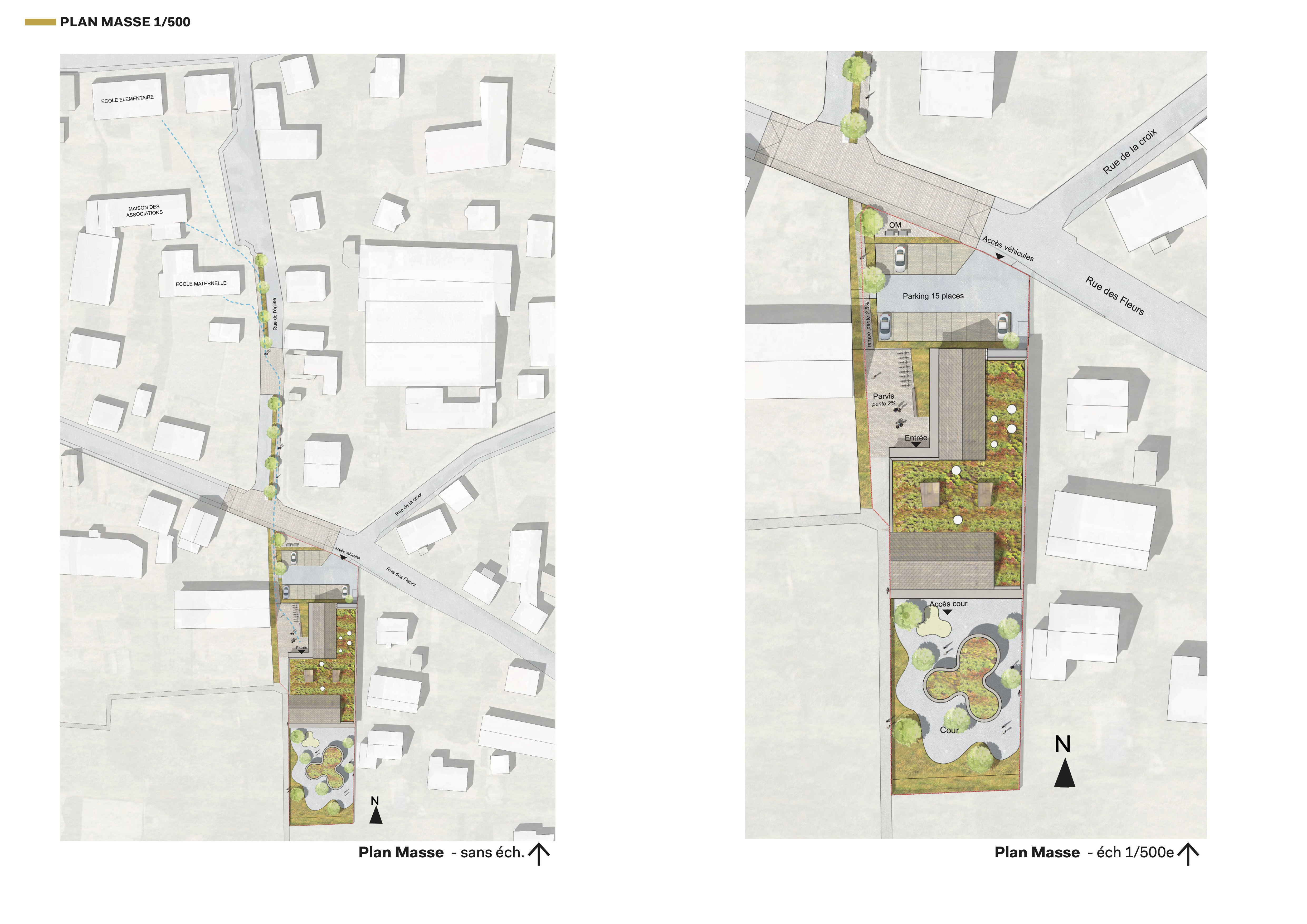 L'implantation du bâtiment permet de créer un parvis d'entrée généreux et ouvre les salles d’activité au Sud sur un jardin de jeu au calme et ombragé. Les volumes dessinés assurent une transition douce avec l'existant en réinterprétant de manière contemporaines les formes de toitures traditionnelles. Chaque pôle s'organise autour d’un espace central qui sert à la fois de hall, de vestiaire, et de distribution de l’ensemble des pièces. Ce dispositif permet de garantir un fonctionnement simple pour les enfants tout en permettant au personnel une surveillance aisée des accès et des circulations.