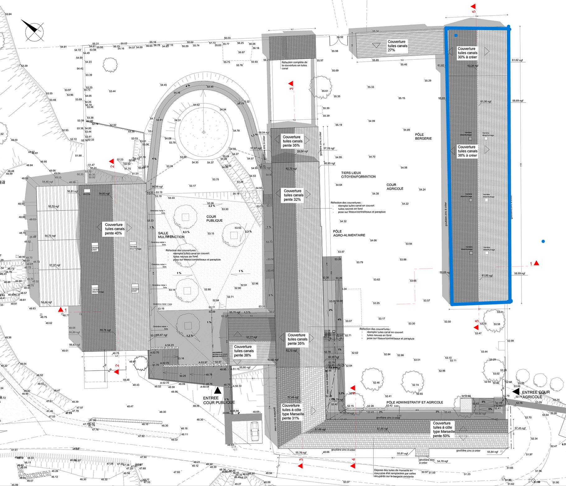 Approche environnementale : Le projet a été labélisé BDO OR. Le site a été soumis à plusieurs contraintes (Site classé, Avis de l'ABF, de la DREAL et de la CDNPS, périmètre Natura 2000, ZNIEFF...). Dispositifs mis en place : insertion de nichoirs pour les chiroptères dans le bâtiment, Eau de toiture récupérée dans château d'eau, assainissement par filtre à roseaux Choix de matériaux biosourcés : isolants + bois français Choix de matériaux géosourcés : pierre + tuile Réemploi des matériaux de site : pierres existantes pour créer mur de soutènement, barbacanes en tuiles de site récupérées