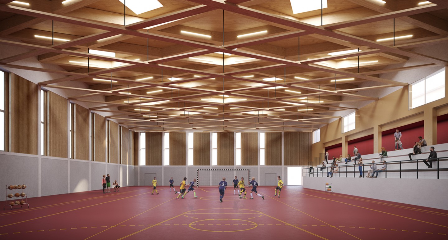 Le gymnase, vaisseau amiral du bâtiment, trône sur son promontoire. Cette belle pièce (30x52 m) est coiffée d’une charpente bois tridimensionnelle « en nappe » d'une portée de 30m. À 9 m du sol, sa structure ajourée, légère et à forte inertie, s'étire sur 2m de hauteur. Elle joue avec la lumière naturelle zénithale, captée par des oculi et diffusée par rebonds entre les poutres bois et les fins contreventements en métal. Ce dispositif "aérien" crée une ambiance chaleureuse, renforcée par un parement acoustique en bois sur les parois du grand volume.