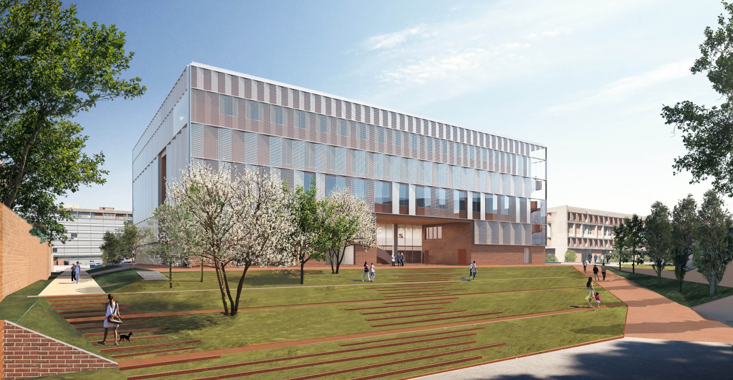 Approche environnementale : Ici l’approche bioclimatique se base sur la recherche de géométries simples et compactes. La superposition des grands volumes (gymnase, amphithéâtres et hall) produit un édifice à forte inertie thermique. La vêture métallique ajourée enceint les façades et les protège de l’échauffement solaire. Les espaces intérieurs traversants bénéficient de ventilation naturelle. Les ouvertures équilibrent l’éclairement naturel et le contrôle des apports solaires. Pour les matériaux biosourcés on citera l’emploi du bois pour la charpente, les façades MOB du gymnase et les aménagements intérieurs.
