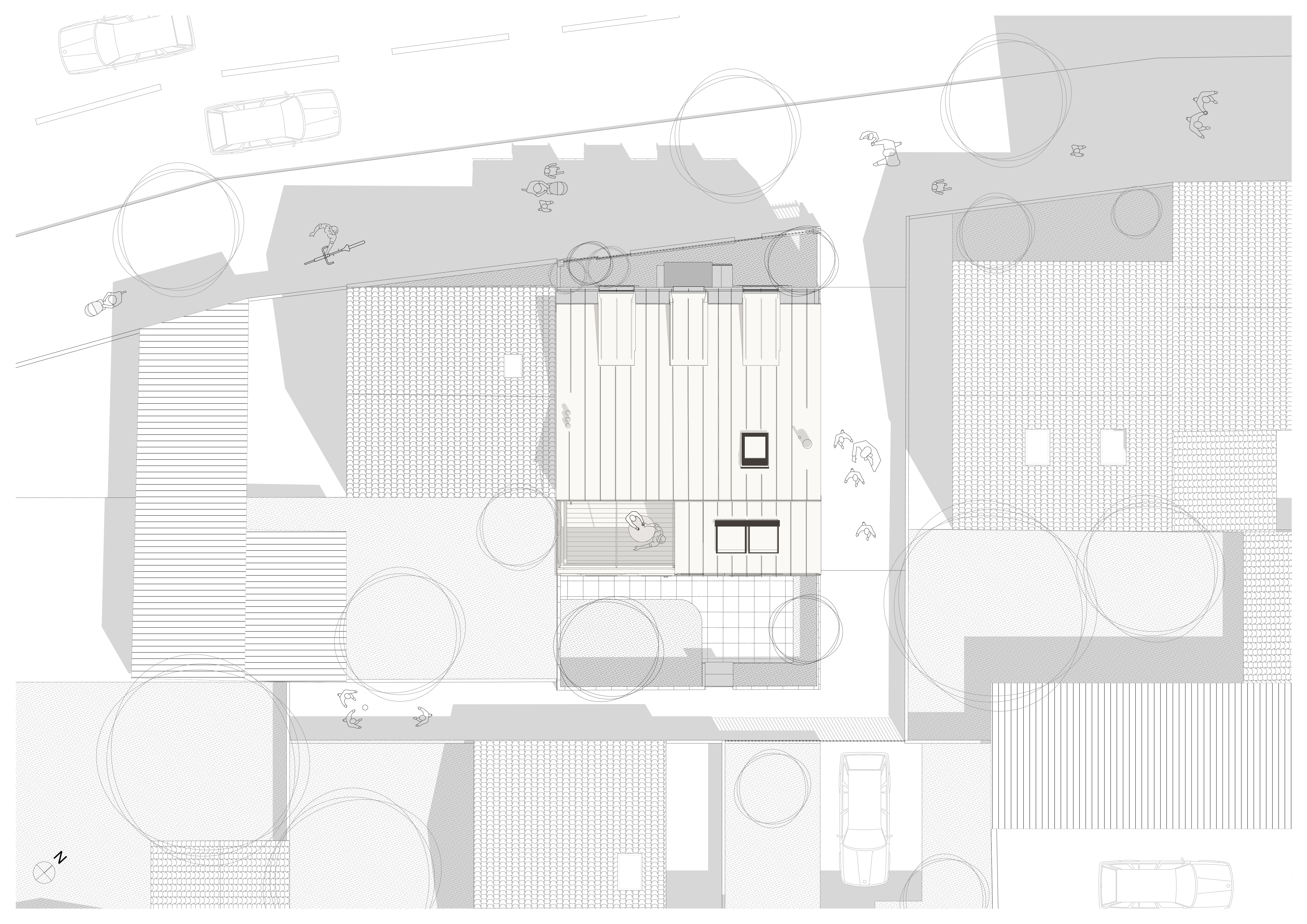 Approche environnementale : Le projet reprend les matérialités et alignements voisins. La dominance du blanc limite les contrastes visuels et l’effet d’ilot de chaleur urbain. L’arrière de la maison se joue des règles du PLU pour créer une volumétrie plus contemporaine et une terrasse au soleil (avec une ossature pour plantes grimpantes). La surélévation est isolée en laine de bois (intérieur) et panneaux de fibre de bois (pare-pluie extérieur). Isolation, ouvertures généreuses et balayage d’air horizontal et vertical, assurent un confort d’usage en toute saisons avec peu d’apport de chauffe ou de rafraichissement.