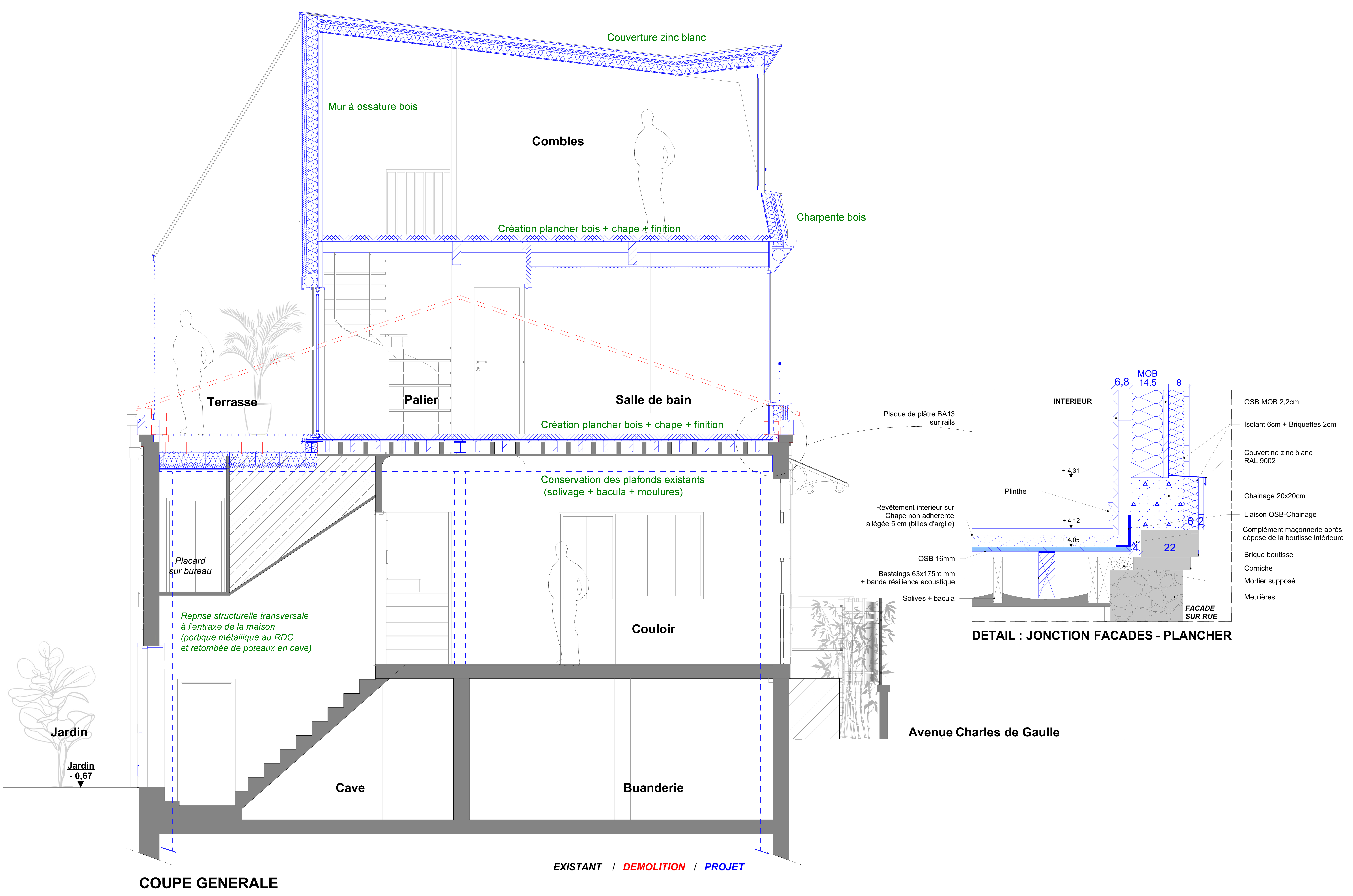 Descriptif technique : La maisonnette fait office de socle. Elle est renforcée par un portique central auto-fondé qui la décharge et a permis d’éviter des reprises de fondations. Les deux nouveaux niveaux s’élèvent en structure bois : ossature poteaux-poutres, murs, planchers, charpente. Deux escaliers superposés, l’un entièrement en bois, l’autre en acier et bois, permettent la circulation verticale intérieure. Les hauteurs de constructions sont très limitées par le PLU, chaque centimètre de construction compte. Le plancher bas du premier étage est enchâssé avec le plancher haut du rez-de-chaussée (support du bacula conservé). Le plancher haut du premier étage est laissé apparent pour optimiser la hauteur sous plafond (via la hauteur entre solives) mais aussi et surtout pour profiter de la chaleur du bois.