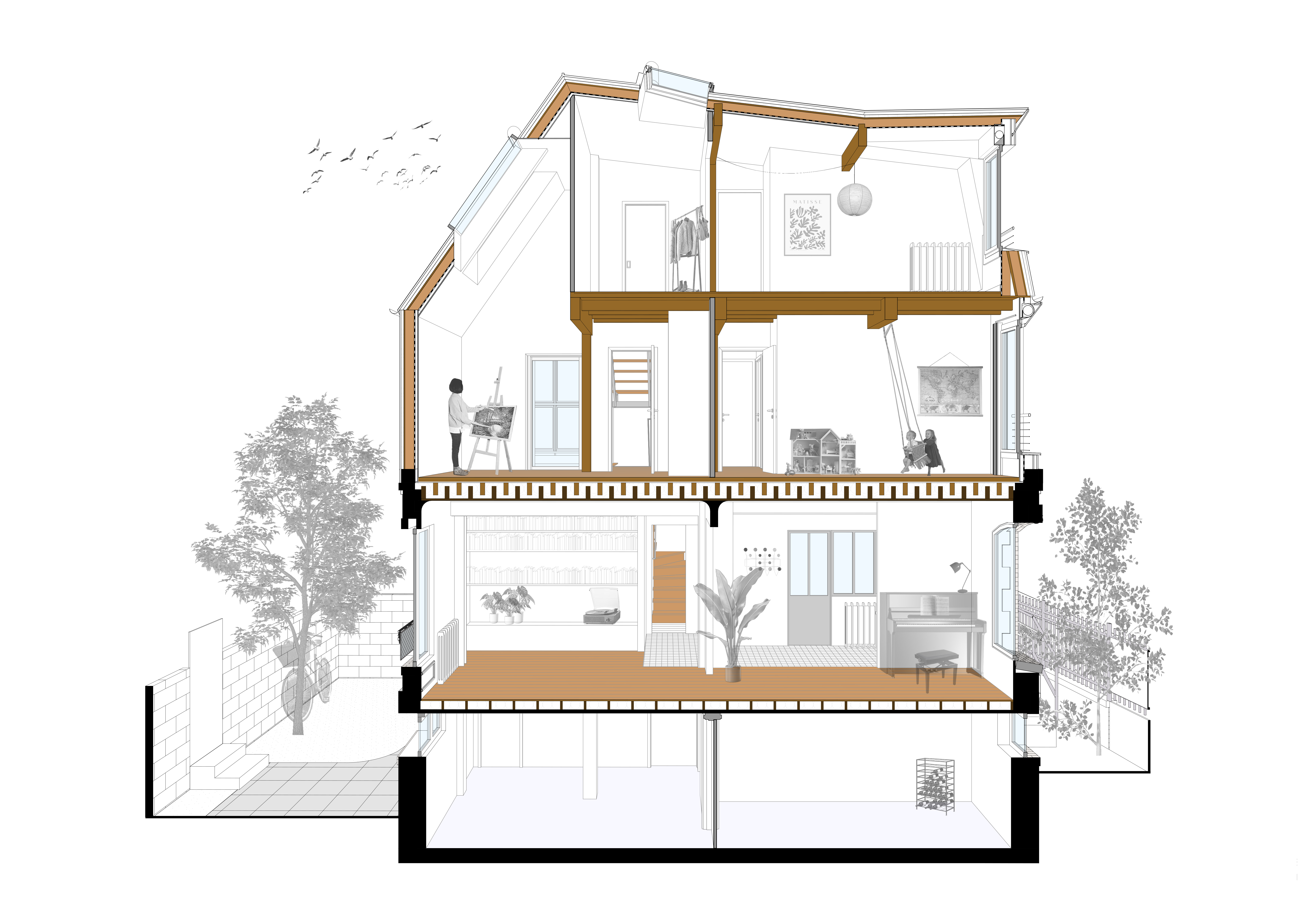 Dans un contexte urbain, une maison en brique et meulière (début XX) cachée par des bambous, comptait deux niveaux : un rez-de-chaussée habitable et une cave en rez-de-jardin. A l’instar de la famille, la maison doit s’agrandir. Le projet la surélève sur deux niveaux de plus. La maison étant de facture modeste et dans un contexte dense, le bois s’impose pour sa légèreté et facilité de mise en œuvre. La ville, classiciste, souhaite préserver l’aspect minéral de la ville : construire en bois est un vrai défi. S’il est invisible en façades, il se déploiera de manière intimiste dans la maison.