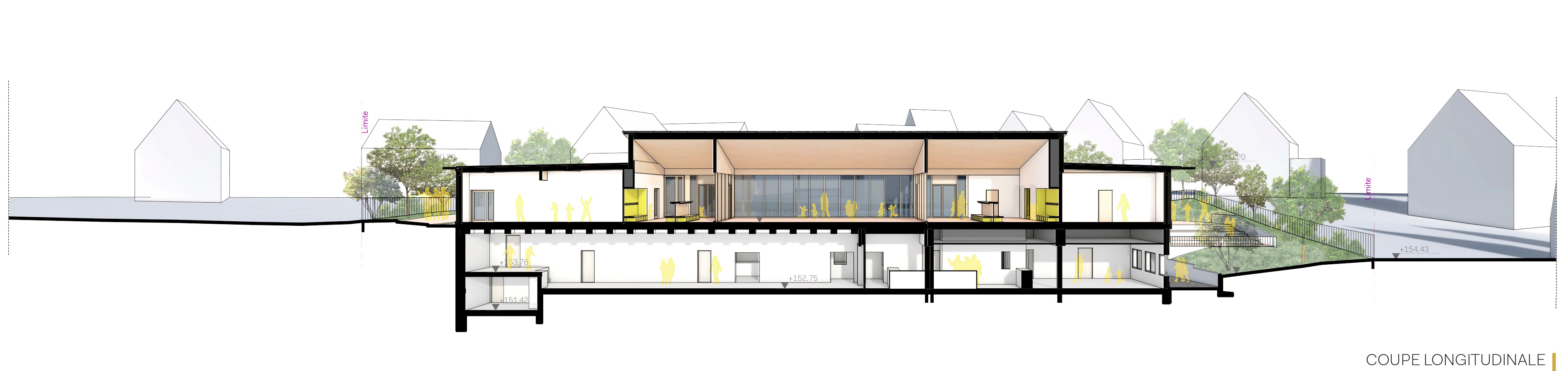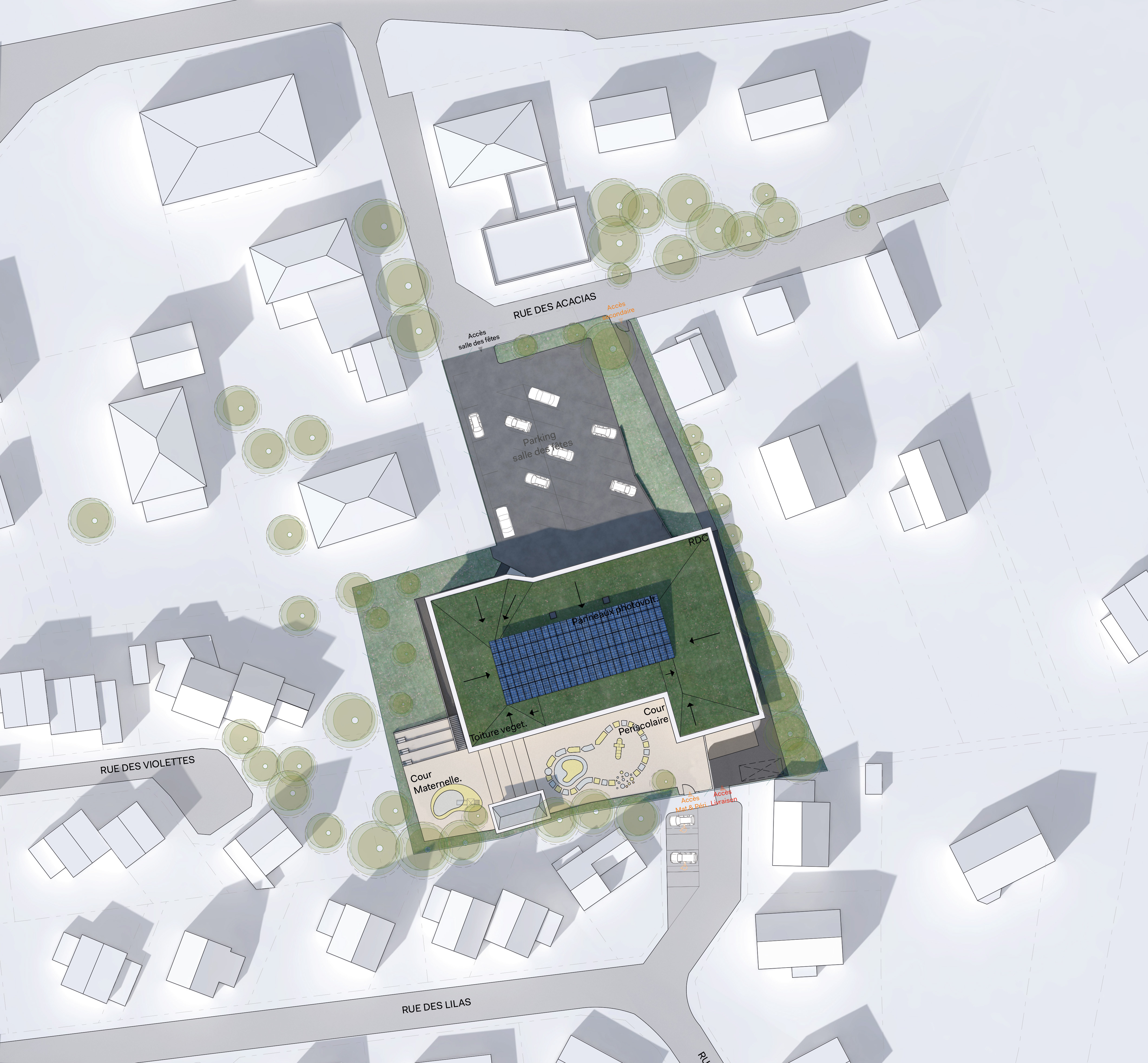 Chaque pôle (périscolaire et maternelle) est organisé autour d’un espace central qui sert à la fois de hall, de vestiaire, et de distribution de l’ensemble des pièces. Ce dispositif permet de garantir un fonctionnement simple appréhendé facilement par les enfants tout en permettant au personnel une surveillance aisée des accès et des circulation. Au centre, la salle de motricité s’ouvre en transparence sur les deux halls. Un préau généreux ouvert au Sud permet d’étendre la salle de motricité vers l’extérieur et d’abriter en même temps les deux accès au bâtiment.