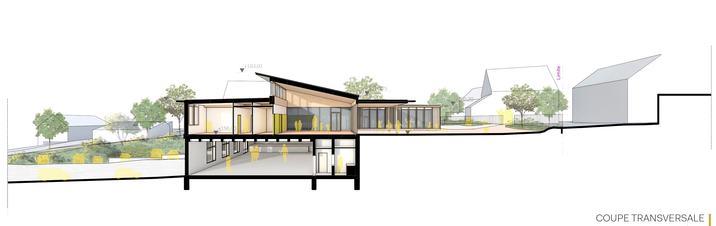 Descriptif technique : La structure du projet est atypique car il s’agit d’une surconstruction bois sur une structure béton existante (R-1). Les besoins d’usages de la salle des fêtes ont fortement inluencés le dessin de la superstructure en bois Eclairage à base de panneaux LED à faible luminance avec détection de présence et modulation en fonction de la luminosité ambiante. Photovoltaïque sur haut jour : 9 kWc en autoconsommation et 36 kWc en vente totale. Production couvrant 118% des consommations du bâtiment (bâtiment à énergie positive). Ventilation double flux pour l’ensemble du bâtiment. Modulation du débit par sonde de CO2 ou détection de présence dans les espaces de vie.