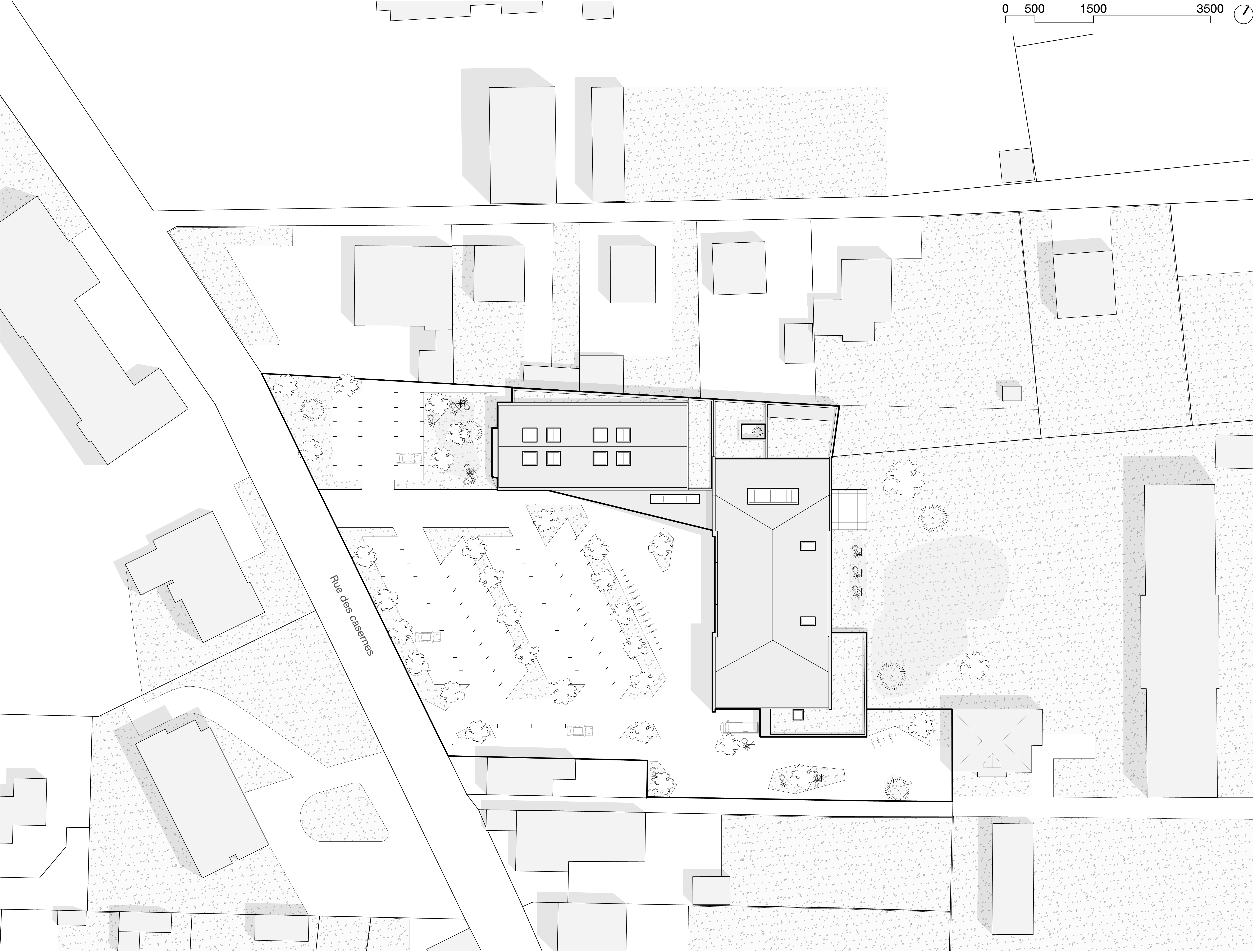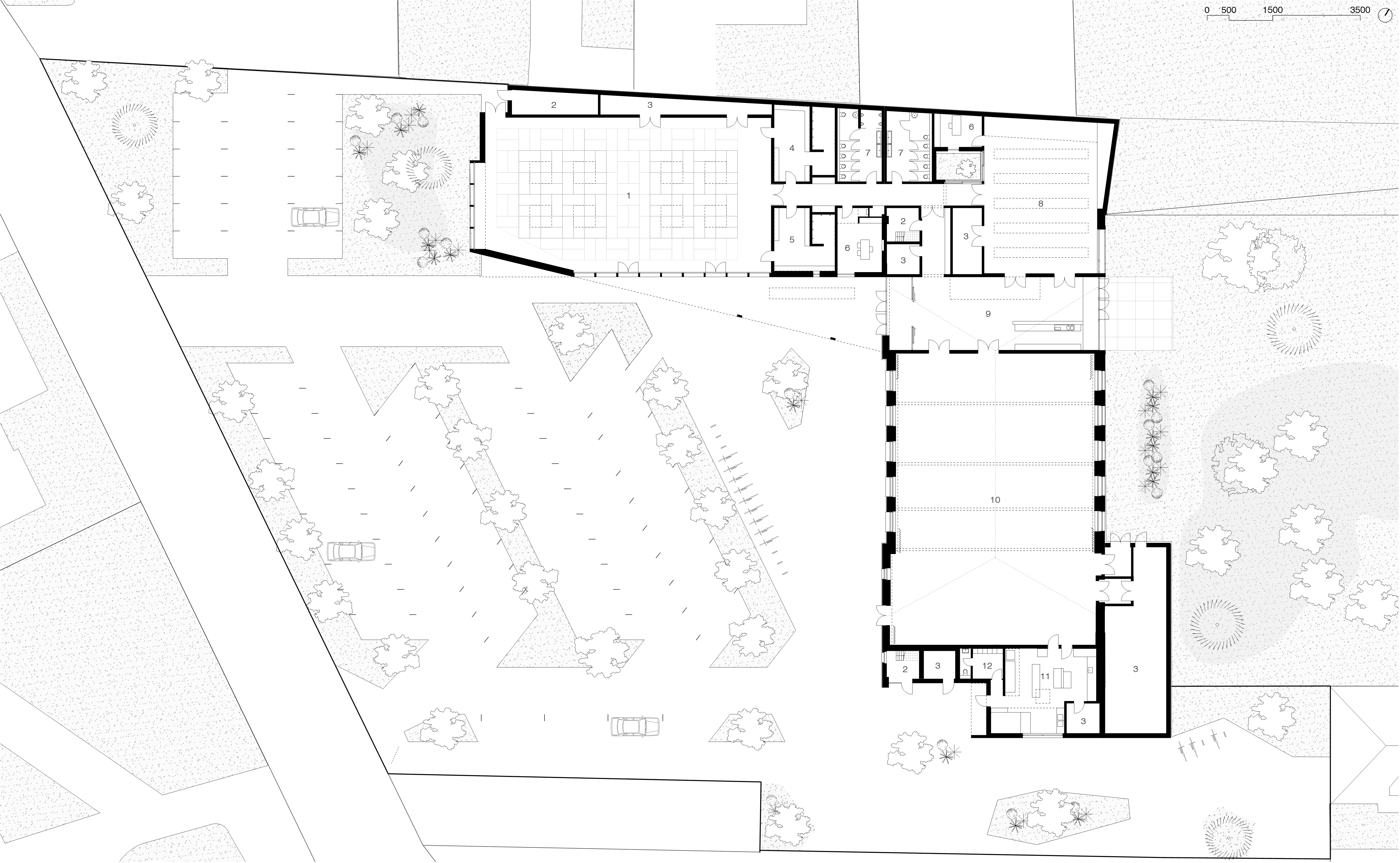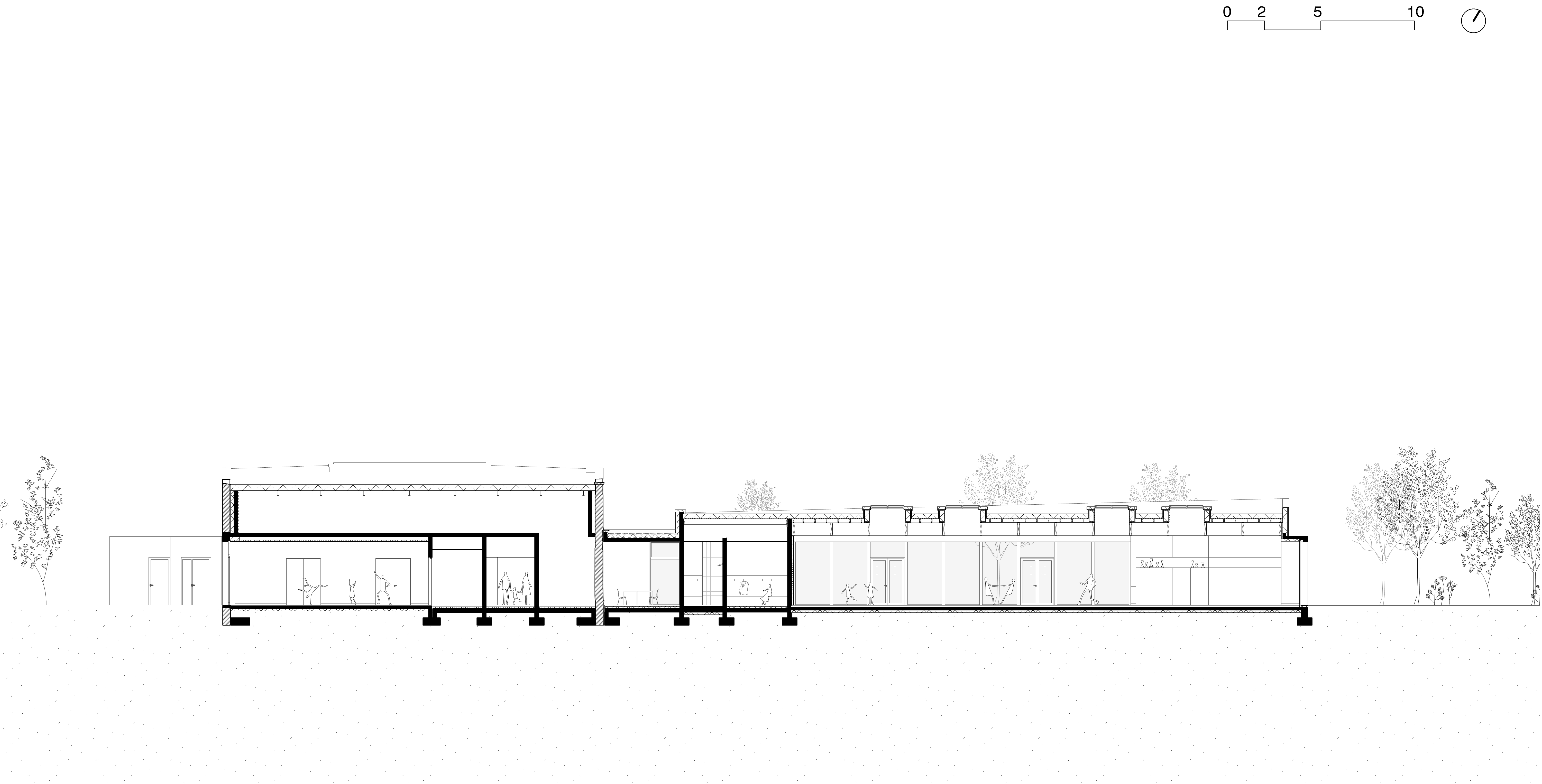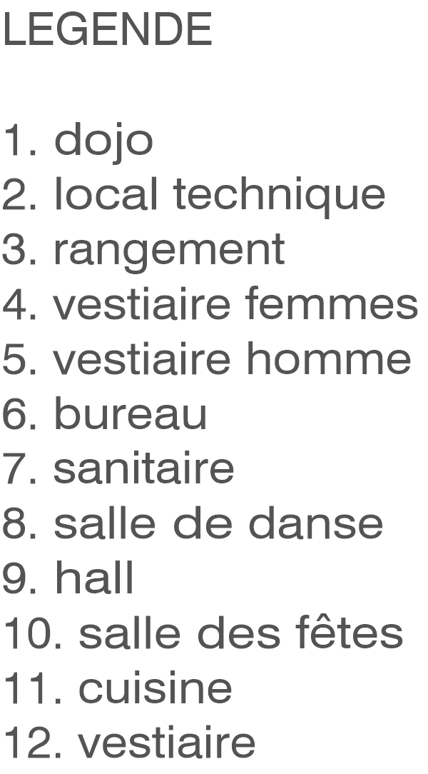 L’ancien Hall Kummer accueille aujourd’hui un espace associatif, sportif, culturel, familial et de loisir. Le bâtiment historique devient salle des fêtes, tandis que son extension comprend un dojo, une salle de danse et un hall traversant vers un jardin aménagé. Le projet vise à valoriser cet ancien magasin de fourrage militaire, patrimoine bâti de Bischwiller. Le dojo joue un rôle de signal en s’avançant vers la rue. Le quadrillage de sa charpente apparente est comme la réponse des tatamis au sol et ses ouvertures zénithales apportent une ambiance zen aux deux aires de combat.