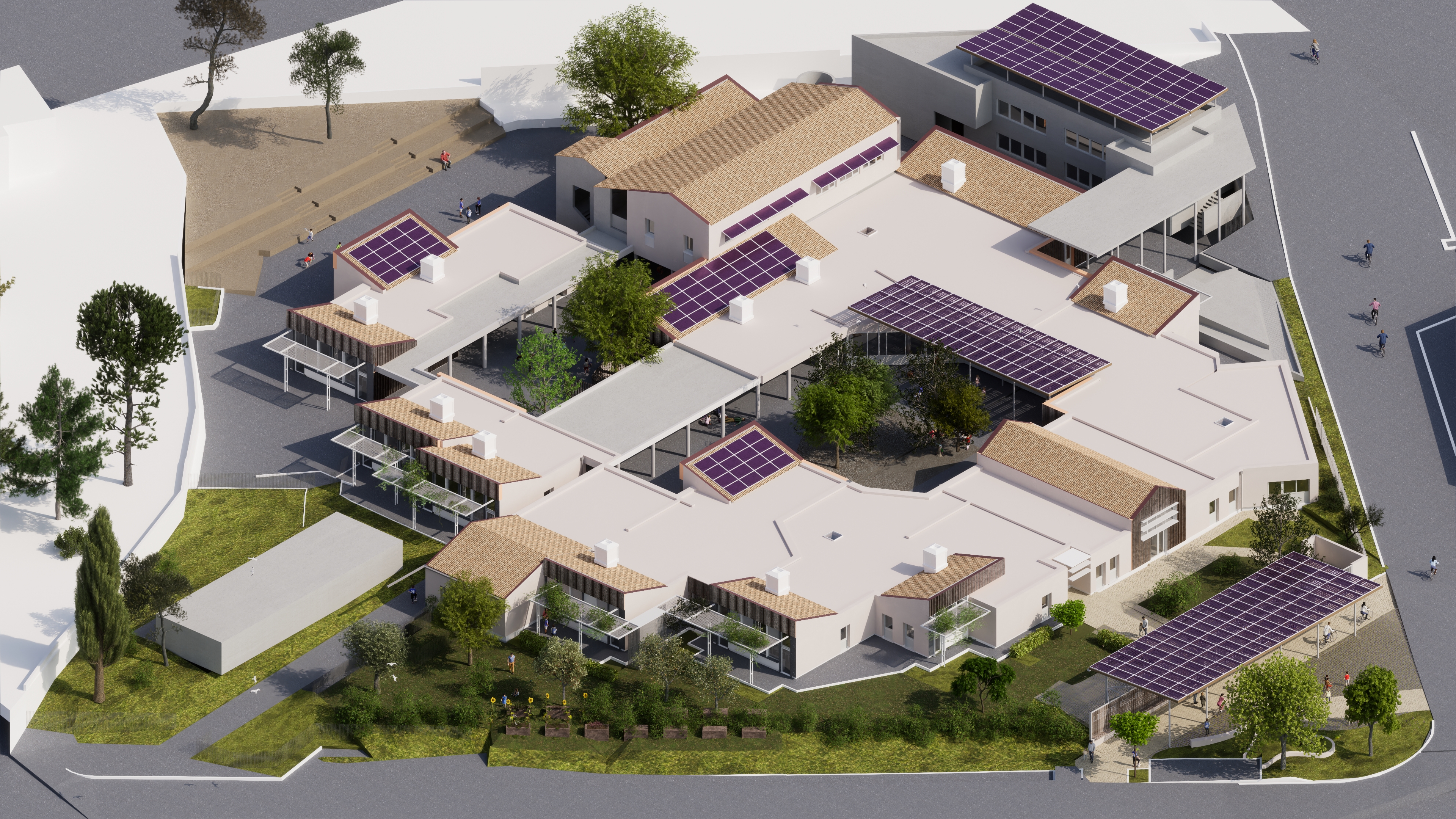 Réhabilitation exemplaire d’une passoire thermique des années 80, avec des volumes disposés en grappe et cours minérales, sans présence urbaine. Par ses nouveaux manteau thermique, préaux et pergolas, et grâce à la création d’espaces extérieurs vivants perméables et plus accueillants, cette grande école (400 élèves) offre une image dans la ville renouvelée et, en repensant l’espace public avec les nouvelles mobilités, les aménités d’un parvis public abrité. Grâce à une concertation continue, le projet réadapte les lieux aux usages, offre confort multisensoriel en toute saison dedans et dehors.