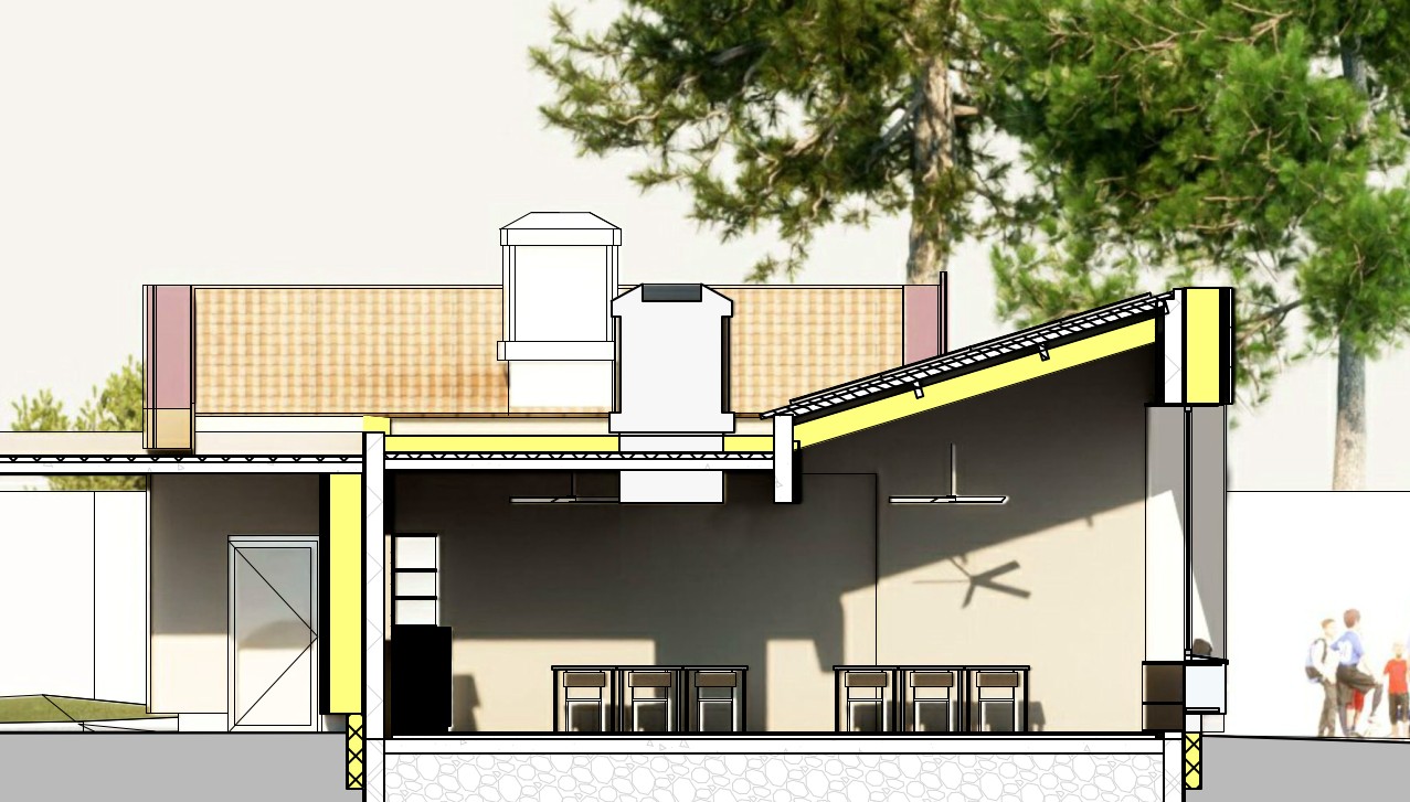 Descriptif technique : Sur un existant en parpaing creux, ITE caisson préfabriqué ossature bois rempli paille : montants 45*220 mm épicéa cl2 certif BTMC (54m3) isolation R=7 botte de paille de blé bio d’Isère 220mm d’épaisseur (157m3) ; contreventement OSB 9 mm (8m3) ;plaque de BA13 hydro - protection au feu. Les modules sont positionnées sur équerres métalliques permettant la garde au sol et fixés aux chaînages BA bas et hauts existants. Parements: bardage bois à claire-voie, absorbants acoustiques, en tasseau douglas prégrisé 45*45 certif BTMC (18m3) ou sur d’autres façades d’un panneau support enduit ventilé 550m² de menuiseries bois-alu, pose à l’avancement dans les nouvelles FOB + protections solaires fixes et mobiles. Palissades et bancs du nouveau parvis douglas et chêne massif PEFC: cohérence matériaux.