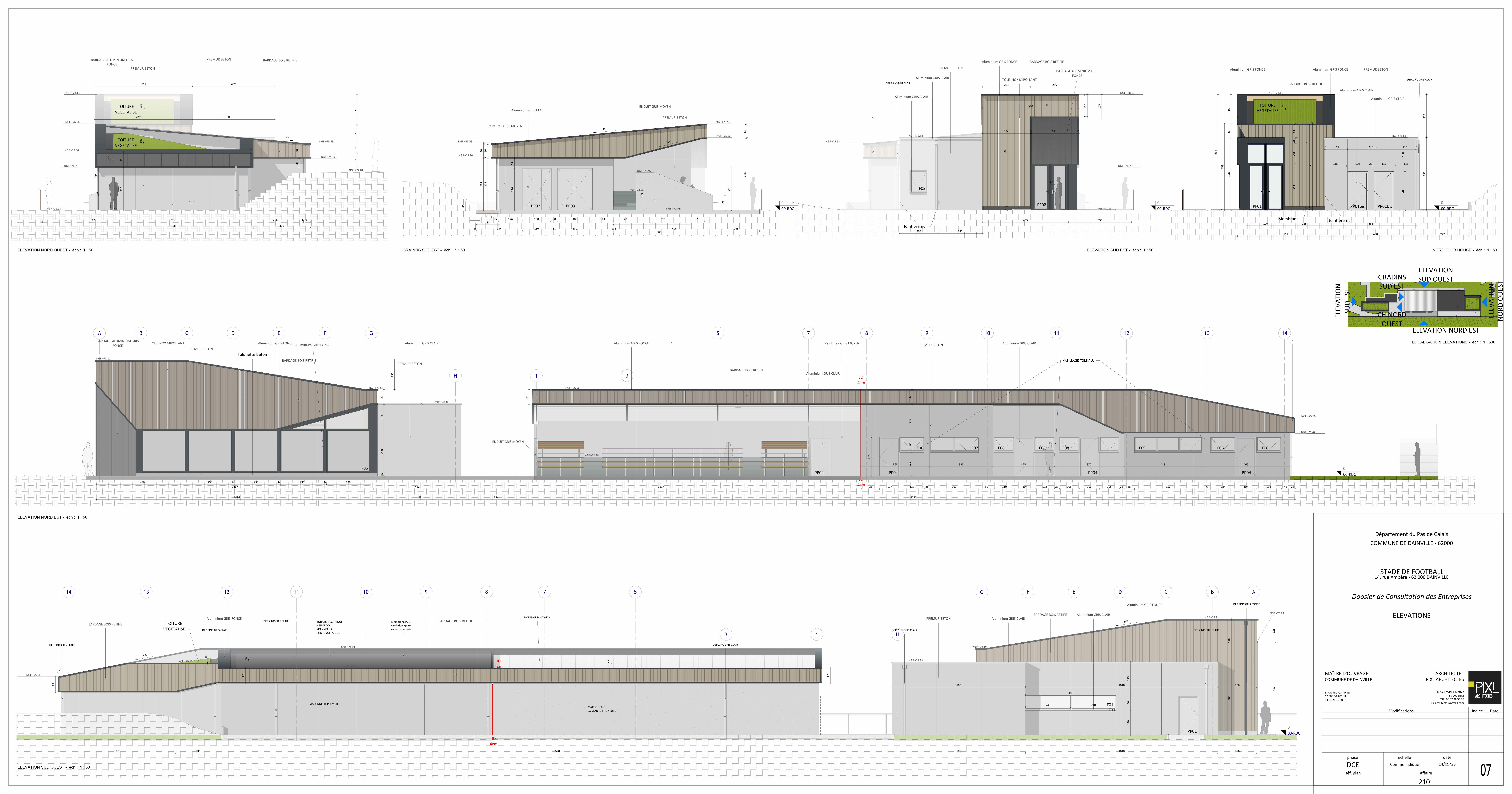 Approche environnementale : Le positionnement stratégique du club house offre une vue panoramique sur le terrain de jeu et souligne l’entrée principale du complexe. Sur le plan énergétique, le projet met en oeuvre des solutions innovantes telles que les toitures végétalisées, les panneaux solaires photovoltaïques,la moquette solaire et ossature bois. Ces dispositifs permettent de réduire la consommation énergétique du bâtiment et de contribuer à la transition énergétique.