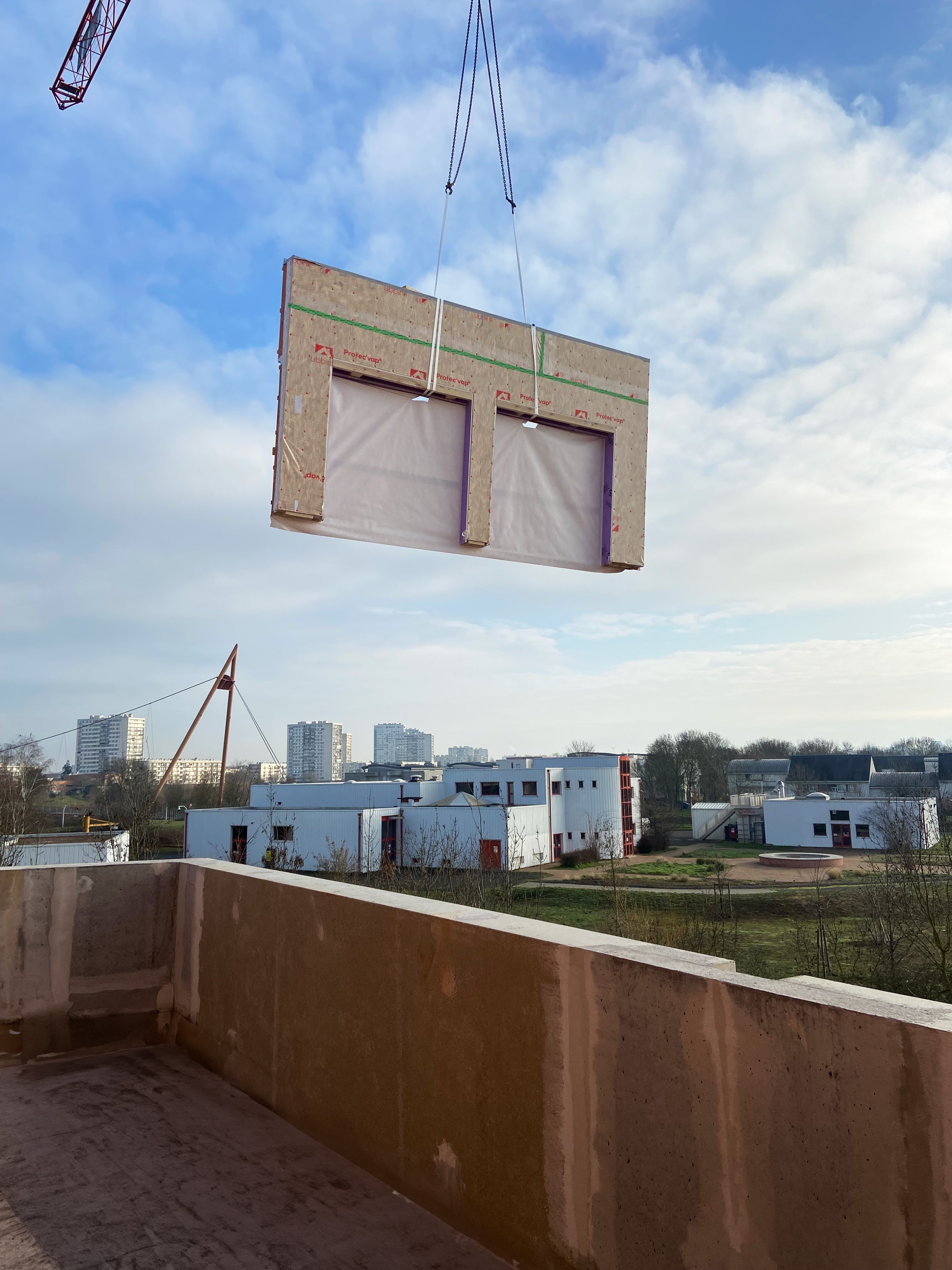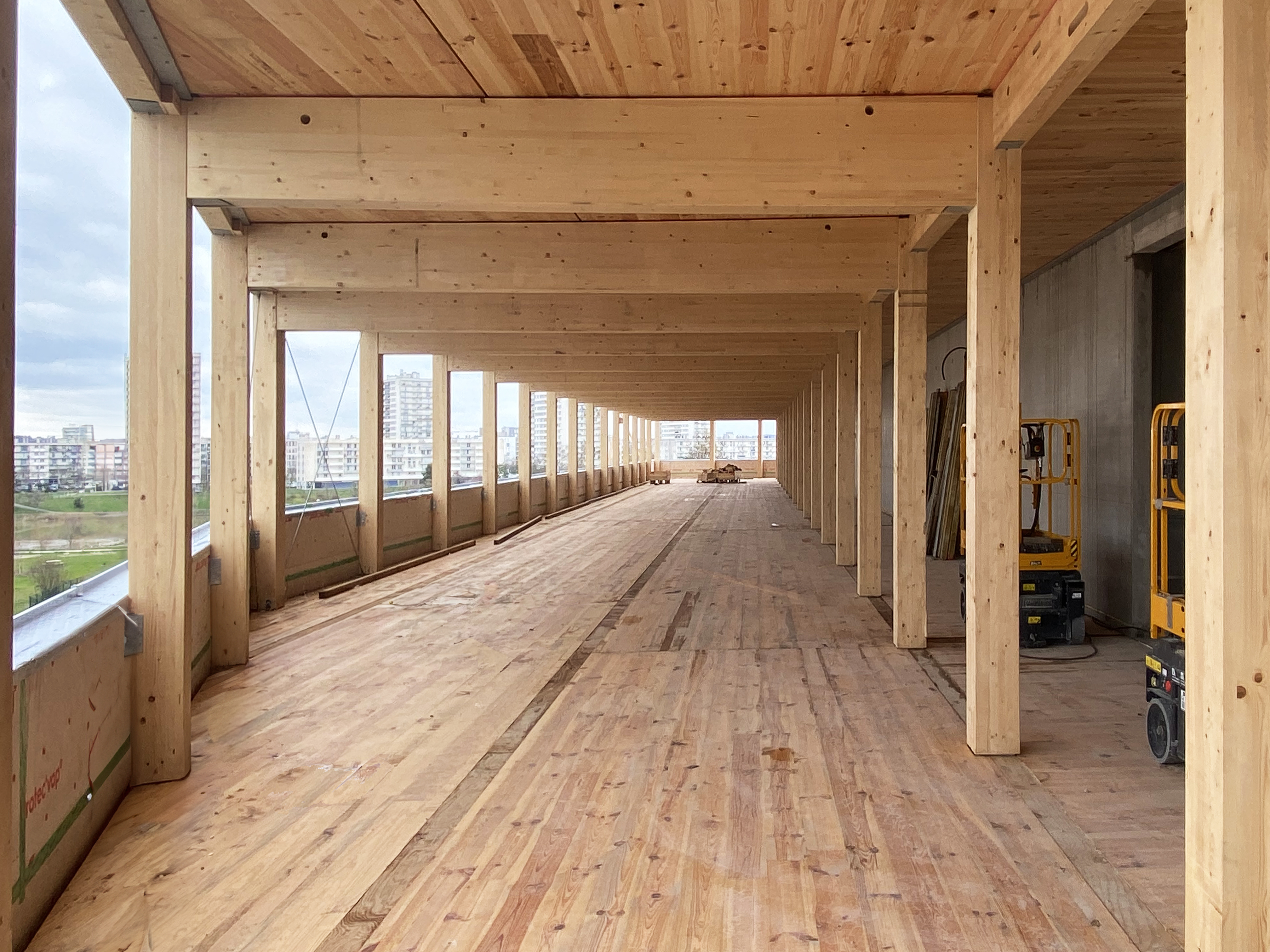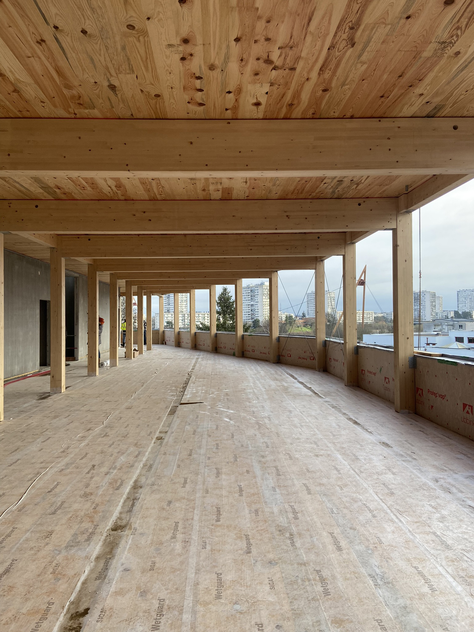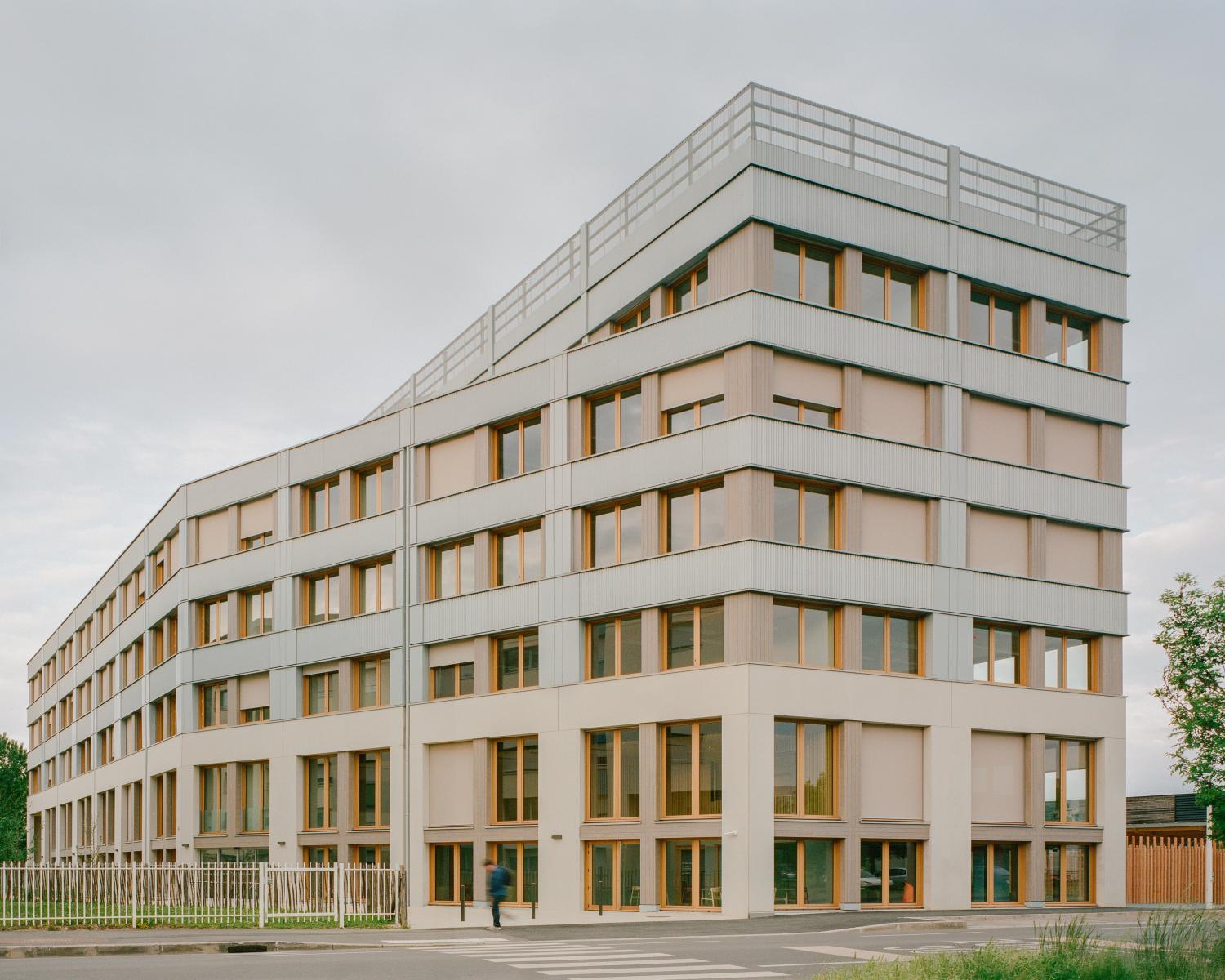 Descriptif technique : Les matériaux du projet sont bruts et résistants. Ils ont un faible impact carbone. Une harmonie de trois matériaux : - Le béton, perenne, rythme le socle avec «monumentalité». - Le zinc, léger et résistant, réfléchit la lumière de façon variée grâce à une alternance de surfaces ondulées et lisses. La structure bois composé par: - 200m3 volume de bois lamellé collé pour la structure poteaux poutre. - 1300m2 surface des murs à ossature bois dont le 70% sont isolés en paille. - 3600m2 la surface des planchers CLT (en lamellé croisé) La paille est naturelle, renouvelable, biodégradable et disponible localement. Elle est propre sur chantier, saine à vivre, hygrorégulatrice et de bonne résistance mécanique lui assurant une bonne durabilité.