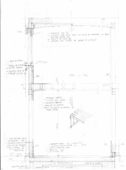 Descriptif technique : Par l’intérieur une nouvelle ossature bois est venue maintenir l’existant qui tenait plus qu’à un fil (déjà évoqué avant) . Cela permis de conserver l’aspect extérieur presqu’en l’état comme une peau ancienne qui ne soutient plus mais qui protège la nouvelle un peu comme une « double peau ». Sur cette ossature et son isolation entièrement de bois a été posé un parement intérieur de terre crue d’une épaisseur 35 mm. Le solivage existant est conservé mais remis à niveau par la réalisation d’un nouveau solivage et un plancher massif posé en écharpe formant diaphragme structurelle pour l’ensemble de la bâtisse. Un escalier entièrement réalisé en freine massif, composé de tasseau et de marches en suspension partitionne l’espace de la maison comme cela avait déjà été fait à l’origine.